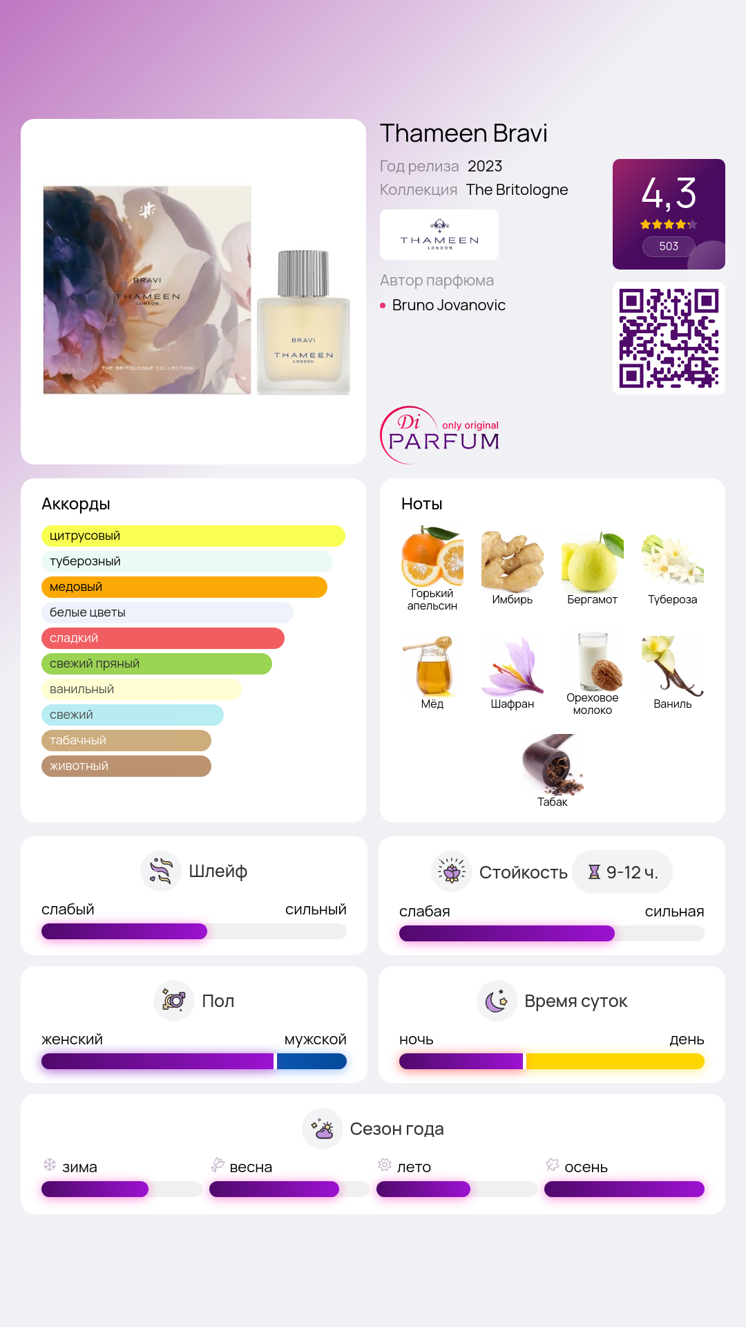 Все, что связано с Лондоном, пропитано очевидной аристократичностью и английской строгостью, и аромат Thameen Bravi не является исключением. Его изысканный облик сразу же бросается в глаза: матовое стекло флакона, эликсир золотистого цвета, словно окутанный легкой дымкой, и рельефная серебряная крышка.