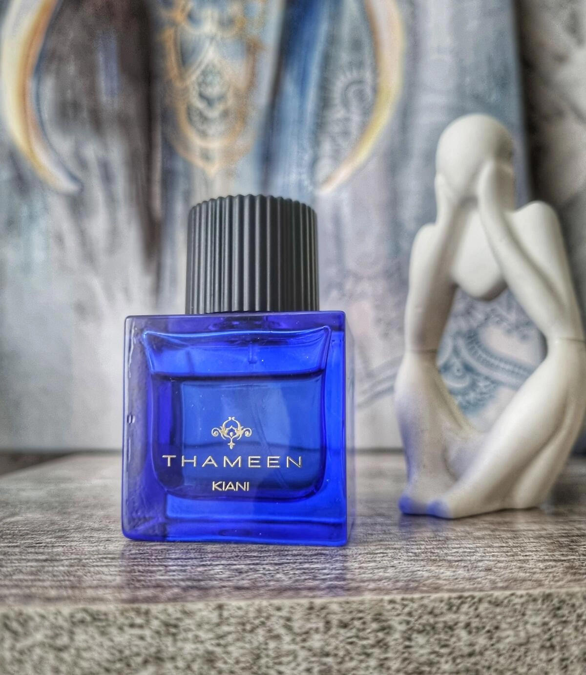 Аромат Thameen Kiani, изысканный и насыщенный пряными древесными нотами, является данью уважения Короне персидских шахов, символизирующей главенство династии Киани. Основание этого произведения искусства выполнено из красного бархата, украшенного изумрудами, рубинами, бриллиантами, жемчугом, а также золотыми и серебряными элементами. Легенды рассказывают о красоте этой короны, а парфюмерная вода стала воплощением мира сверкающих драгоценностей.