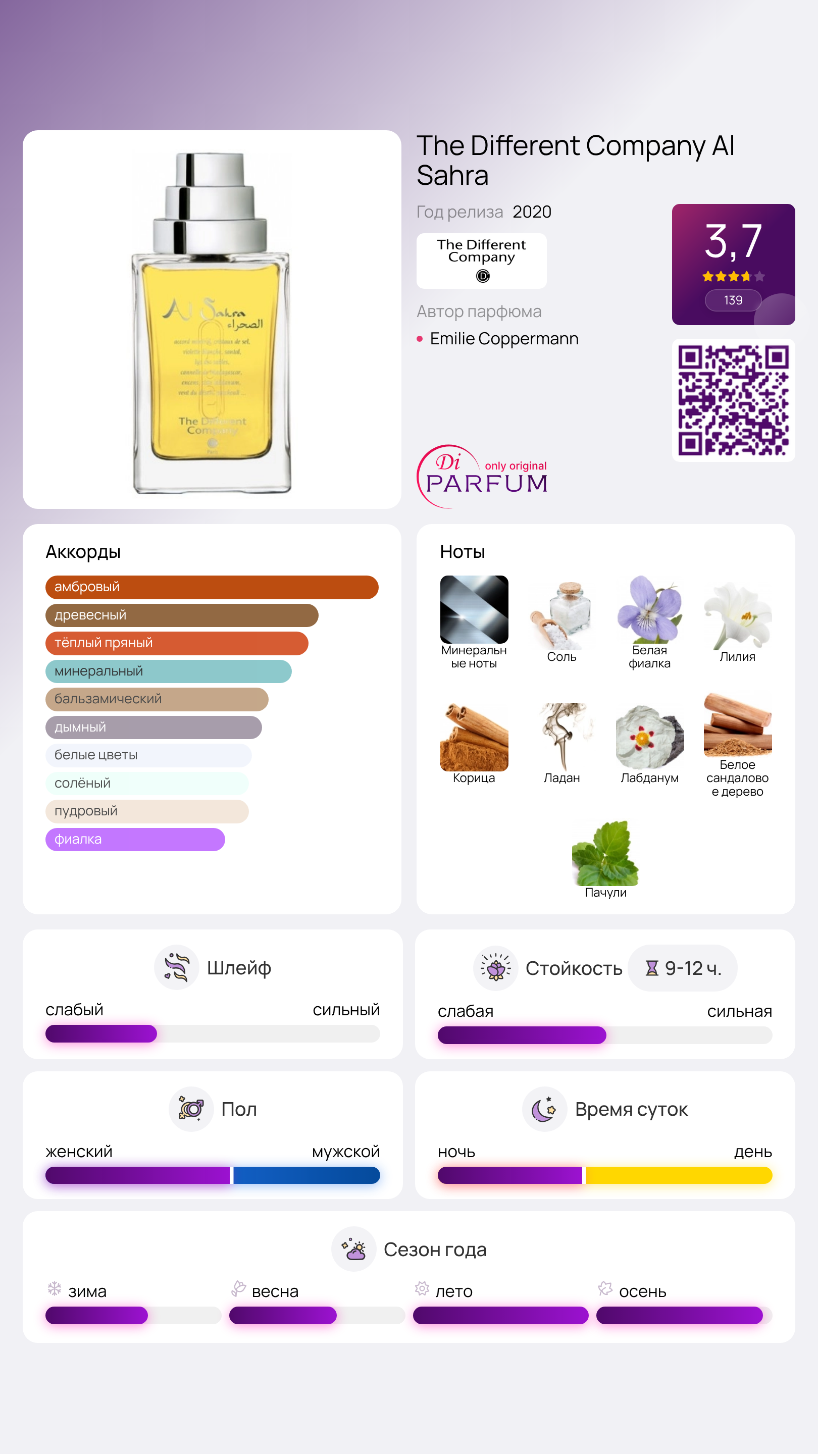 Прелестный фиалковый запах сочетает в себе пряные нотки корицы. Зелено-травяная эссенция цветка окружена смолистым ладаном и восточной амброй. Устойчивый шлейф обволакивает кожу мягкостью сандала с сливочной текстурой, а легкие ноты в финале подчеркивают роскошность композиции Al Sahra от The Different Company, передавая необычную атмосферу ландшафта, где жаркий день сменяется прохладой ночного ветра.