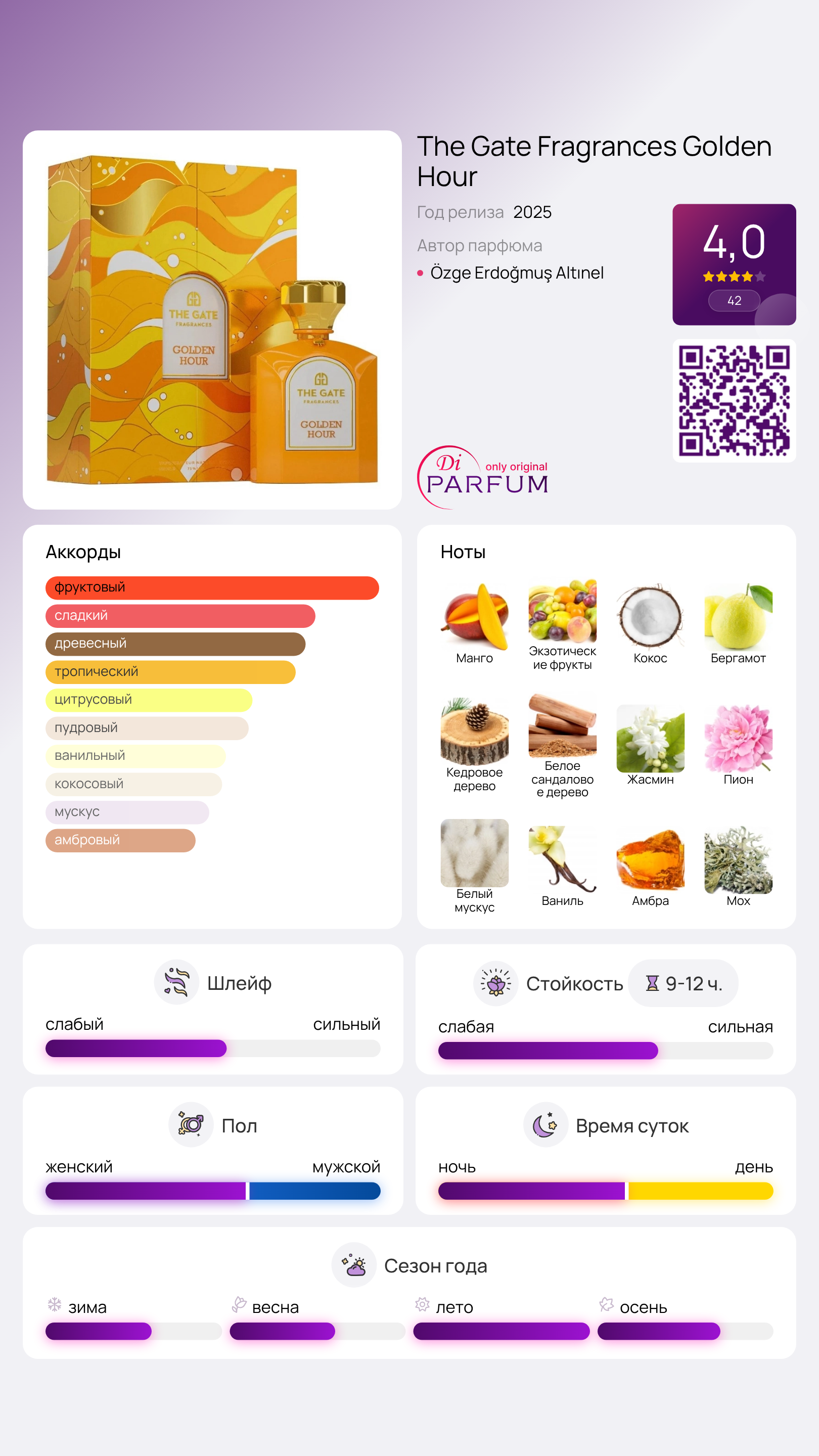 Golden Hour — это яркая фруктово-цветочная композиция, обладающая радостью и уютом, что делает её невероятно притягательной и запоминающейся.
