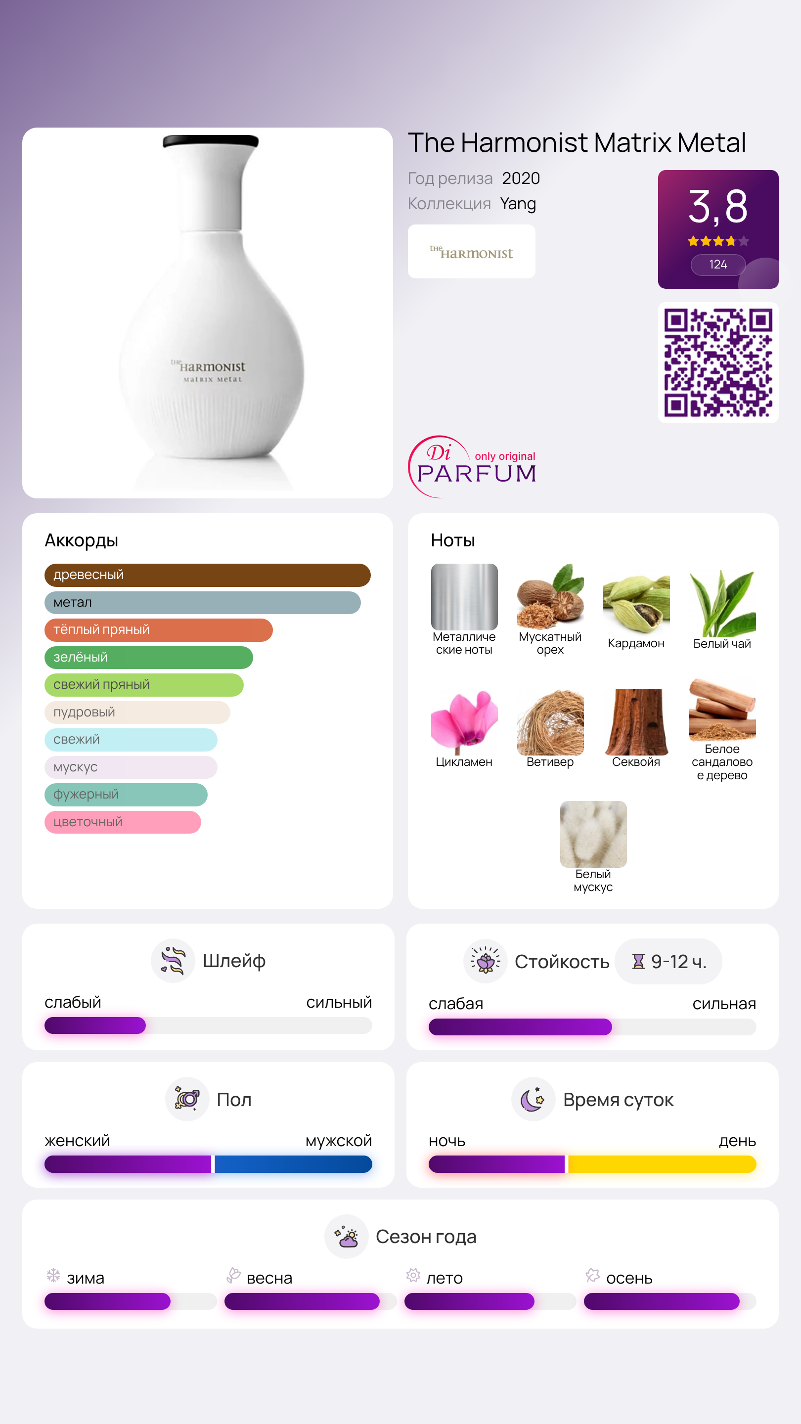 Лола является приверженцем восточной философии фен-шуй, что стало вектором для создания парфюмерных линий, основанных на гармонизации окружающего мира. Каждый аромат олицетворяет одну из пяти стихий: воду, огонь, землю, дерево и металл. Композиция The Harmonist Matrix Metal относится к фужерному направлению и посвящена последней стихии. Жар раскаленного металла, укрощенного матрицей, не таит в себе опасности: в жидком состоянии он еще не имеет определенной формы, но скоро обретет ее, воплощая желания своего создателя. Аромат открывается яркими альдегидными нотами в сочетании с терпкими ягодами можжевельника. Сердце композиции наполняется нотами амбры и древесными аккордами, а в шлейфе аромата также присутствует амбра, но в паре с сосной, ветивером и миррой.