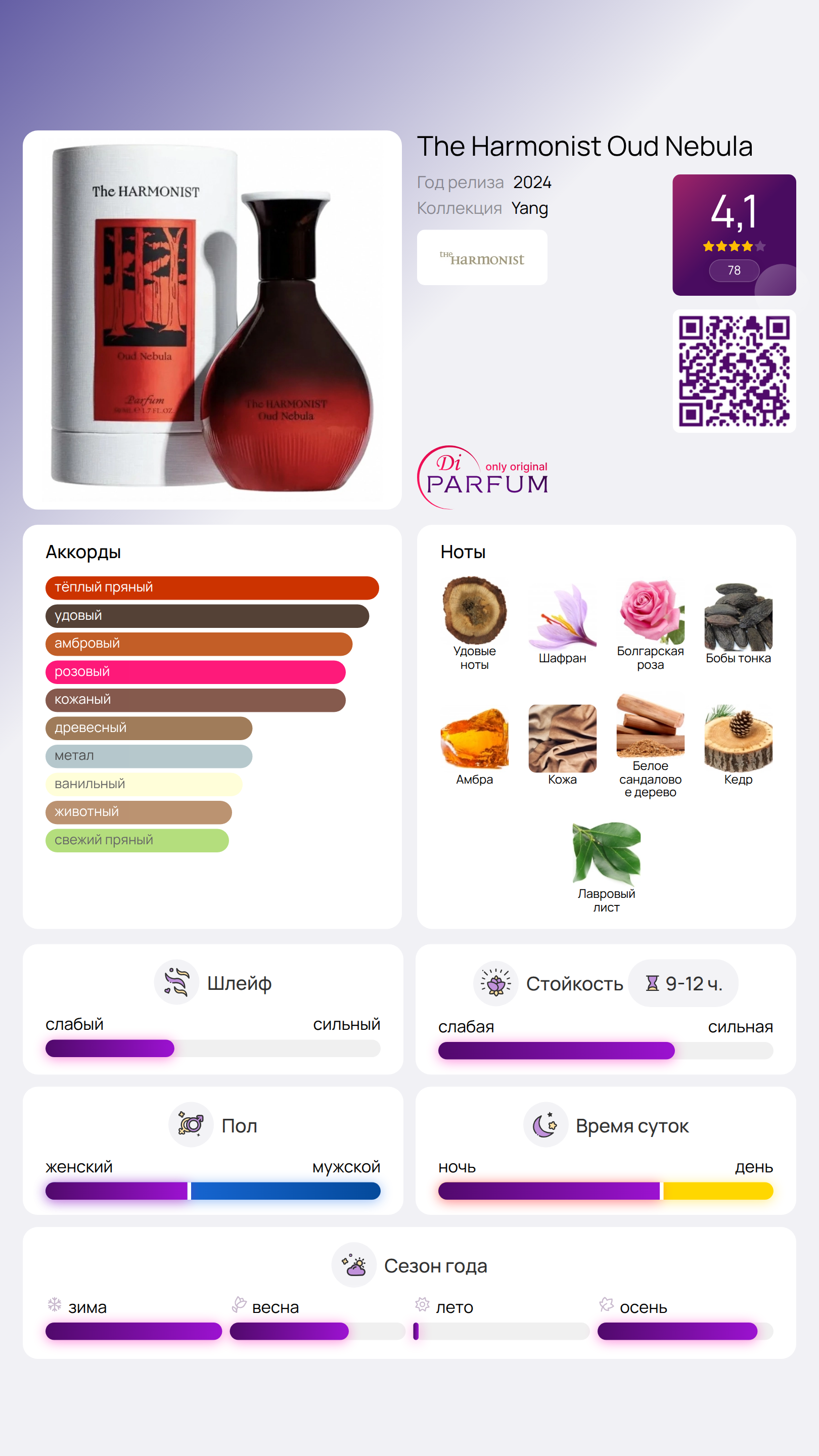 Oud Nebula от The Harmonist – это восточно-древесный аромат, созданный как для женщин, так и для мужчин. Данная новинка была выпущена в 2024 году и представлена талантливым парфюмером Гийомом Флавиньи. Сложная композиция аромата включает в себя ноты уда, шафрана, болгарской розы, бобов тонка, янтаря, кожи, сандала, кедра и лавра.