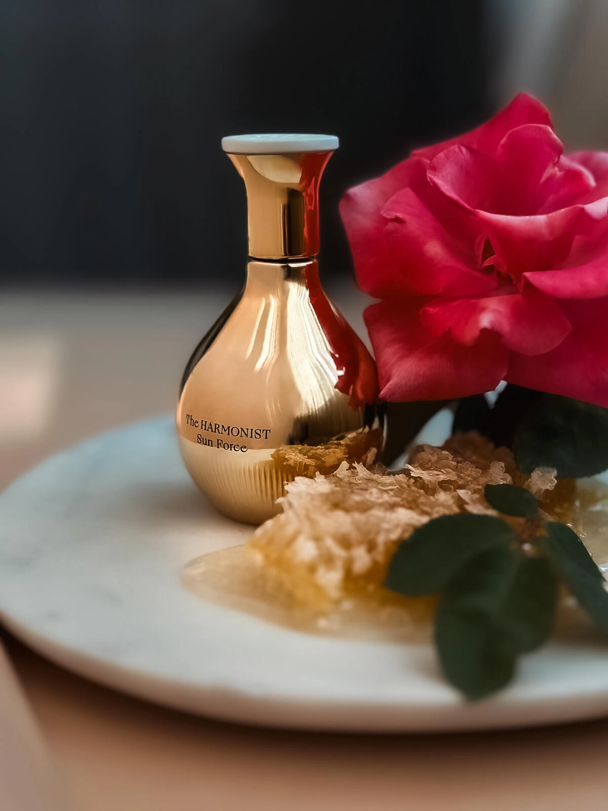 Воздействие аромата начинается с ярких, жизнеутверждающих нот цитрусового помело, дополненных теплой терпкостью шафрана и нежным сладким ароматом болгарской розы. Сердце композиции насыщено многослойным медовым аккордом, освежающими эффектами кардамона и загадочной восковой горчинкой сомалийского олибанума. Легкая дымчатая нота ветивера подкрепляется древесно-хвойным шлейфом The Harmonist Sun Force, завершая аромат в богатых акцентах драгоценного мускуса и сладости бензоина.