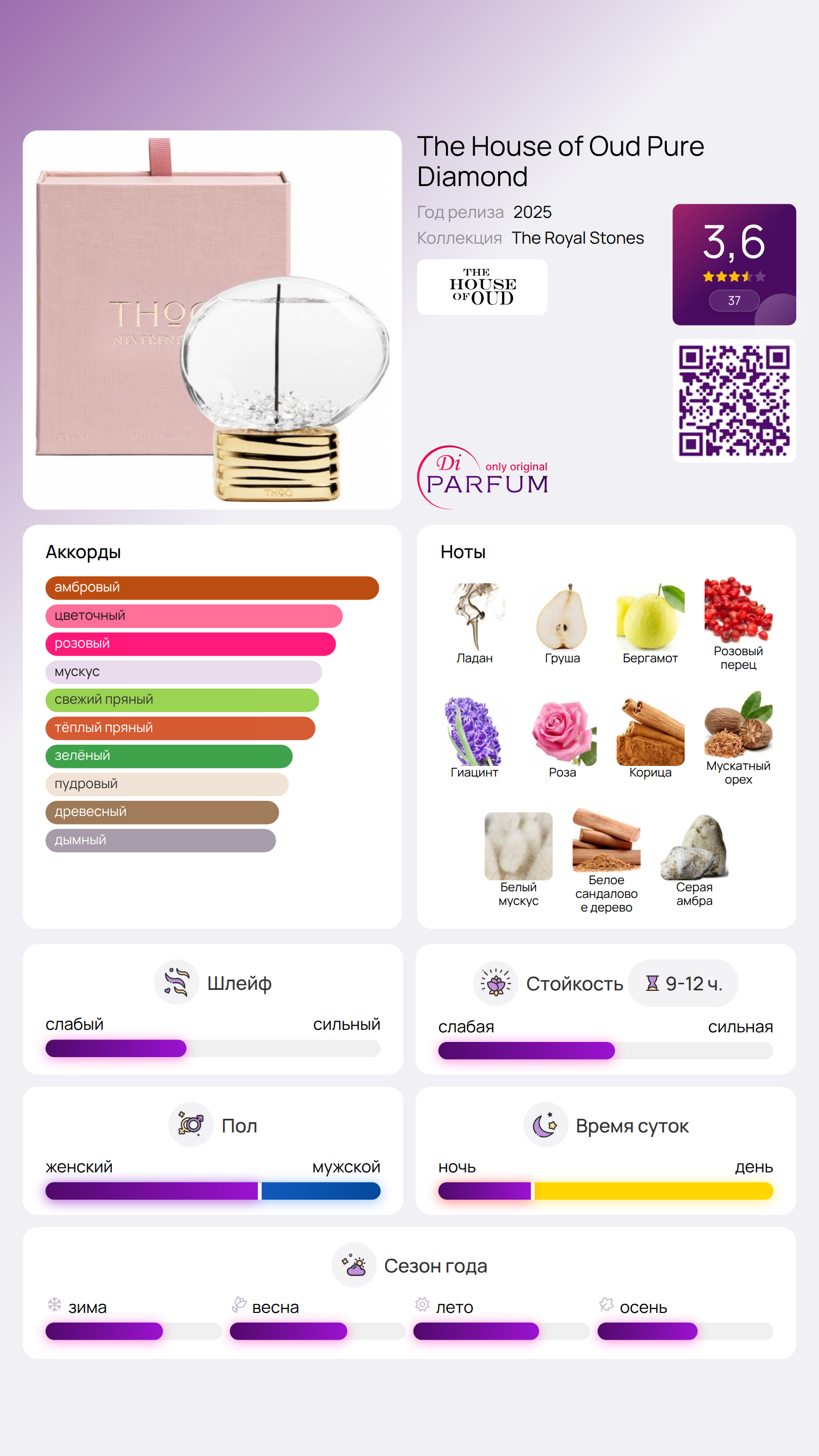 Pure Diamond от The House of Oud — это восточно-цветочный аромат, созданный как для женщин, так и для мужчин. Этот новый парфюм был запущен в 2025 году, и его композитором стал парфюмер Cristian Calabro. В верхних нотах вы ощутите ладан, грушу, бергамот и розовый перец; в сердце композиции раскрываются гиацинт, роза, корица и мускатный орех; а базовые ноты составляют белый мускус, сандал и амбра.