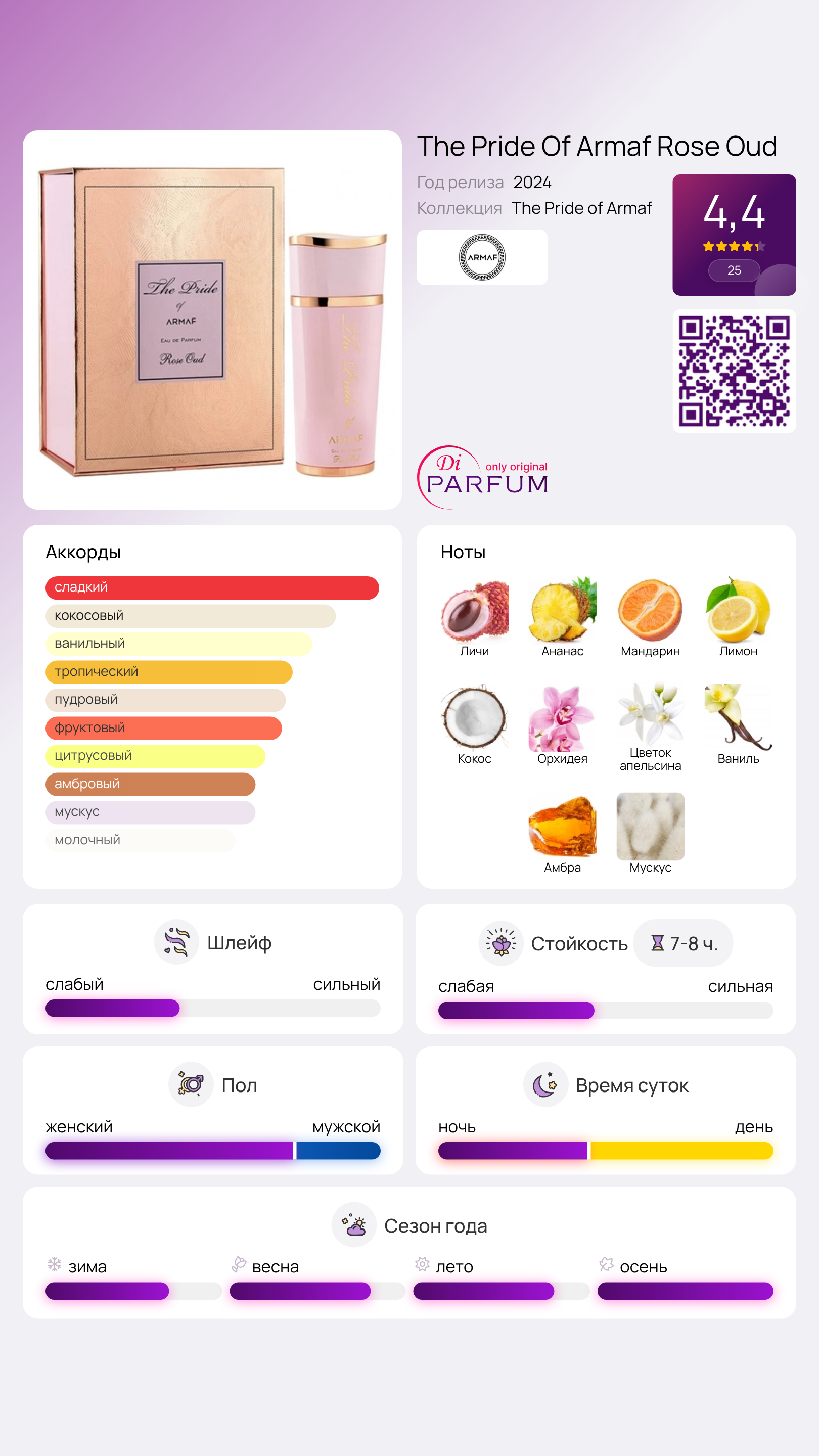 Аромат входит в категории сладких, цветочных и фруктовых, что делает его универсальным выбором для женщин, которые ценят как свежие, так и сладковатые ароматы. С The Pride Of Armaf Rose Oud вы непременно привлечете внимание и оставите незабываемый след.