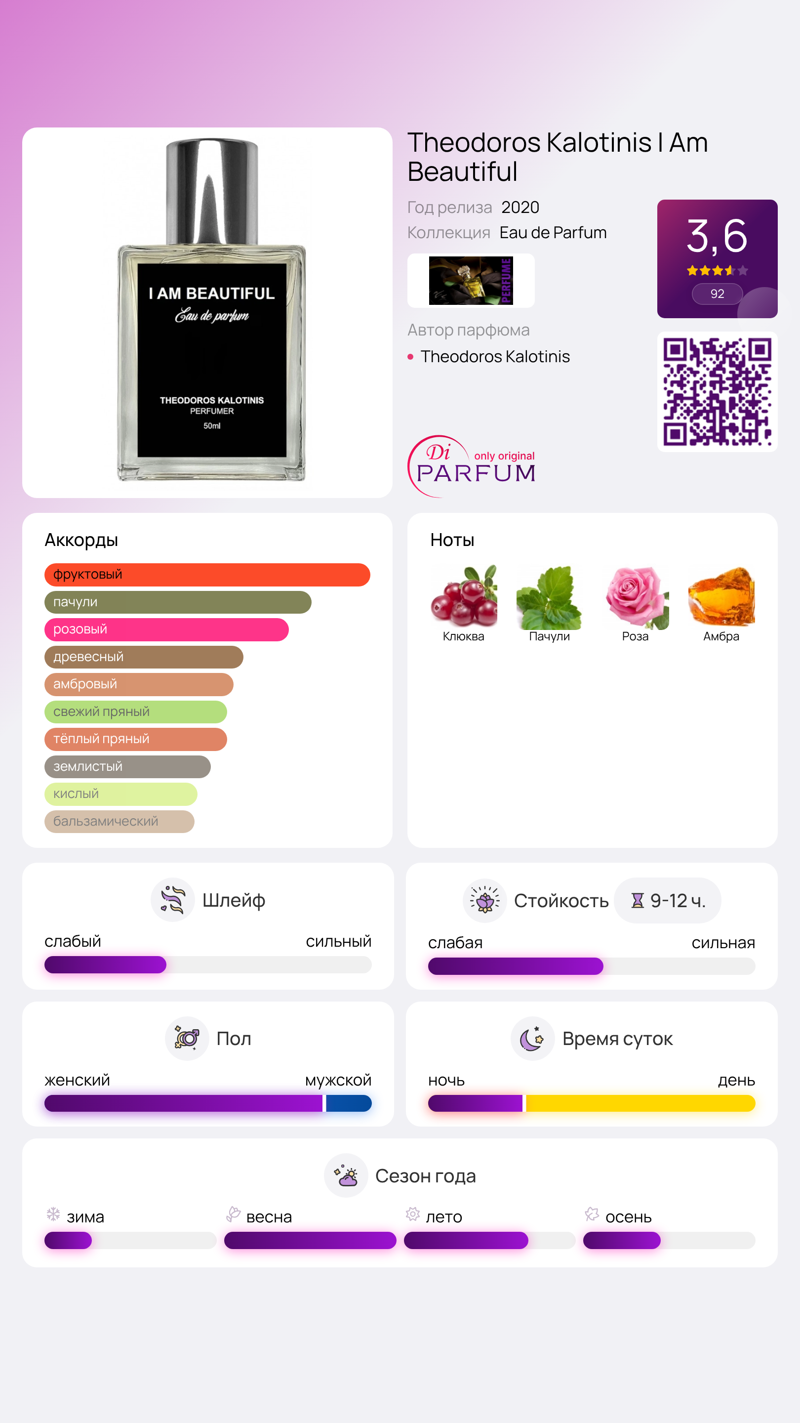 Аромат I Am Beautiful представляет собой неотразимую женственность, окутанную нотами амбры, розы, пачули и клюквы. Он нежно обнимает кожу, оставляя ощущение роскоши, бархатистости и сладкого пудрового шлейфа.