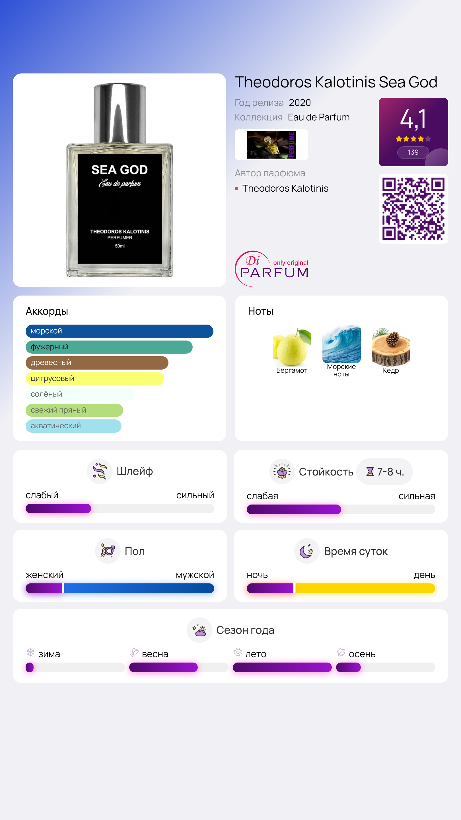 Sea God от Theodoros Kalotinis — это мужской аромат, который был выпущен в 2020 году. За создание этой композиции стоит парфюмер Theodoros Kalotinis. В верхних нотах раскрывается яркий бергамот, за которым следуют глубинные морские ноты в сердце композиции, а завершают аромат теплые и древесные аккорды кедра.