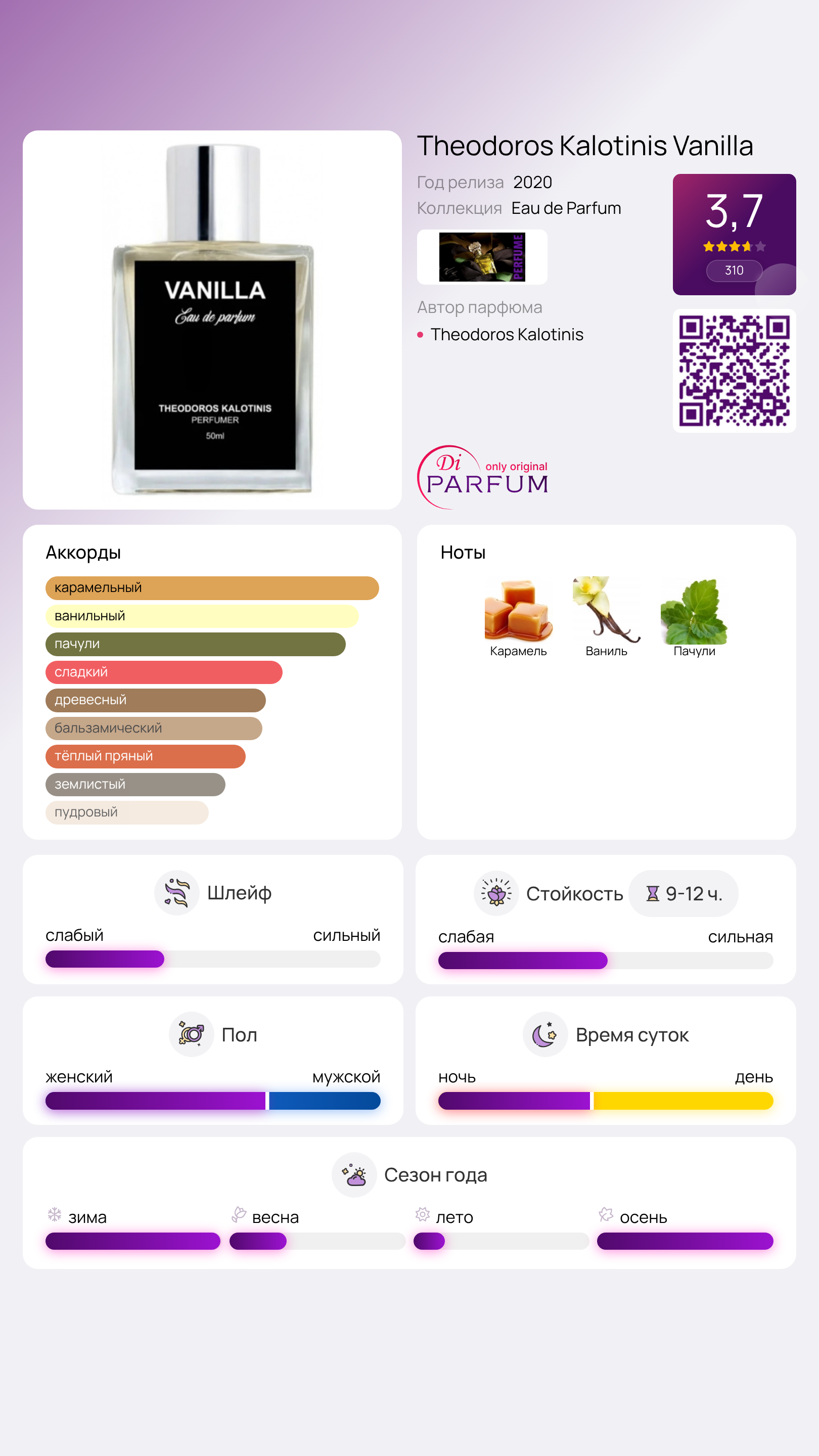 Аромат находится в семействе гурманских и восточных парфюмов, что делает его особенно привлекательным для тех, кто ценит теплые и насыщенные ноты в своих fragrance. Подчеркните свою индивидуальность и создайте настроение с помощью Vanilla от Theodoros Kalotinis - аромата, который не оставит равнодушными!