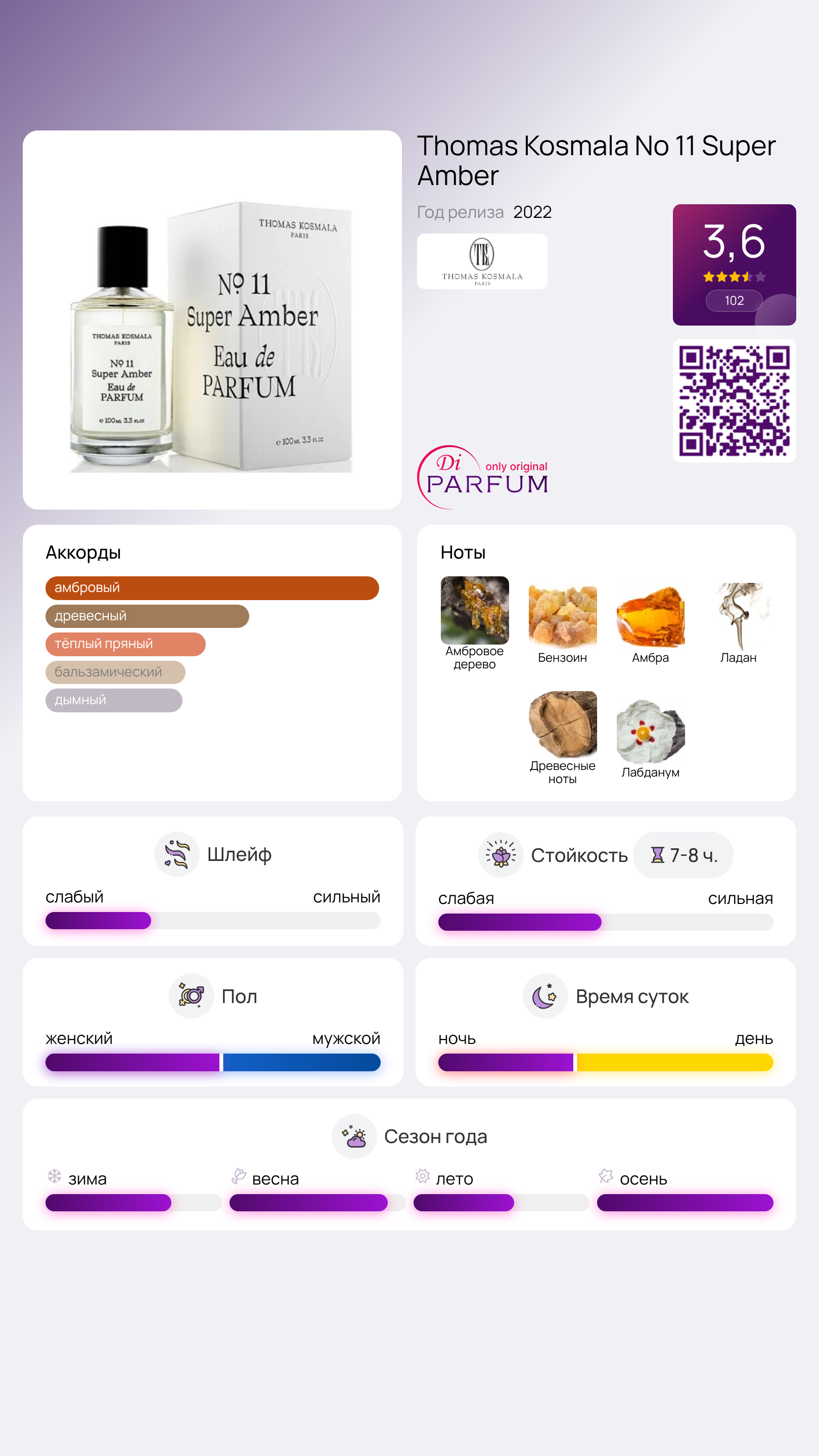 Ольфакторная структура No 11 Super Amber от Thomas Kosmala отличается минимализмом и лаконичностью, но в ней скрывается множество нюансов и оттенков. В верхней ноте доминирует спокойный и умиротворяющий ладан, который с первых мгновений наполняет пространство, создавая атмосферу расслабления и уюта. В сердце этой необычной гурманской композиции находятся томные ноты дымного бензоина и переменчивого лабданума, которые в сочетании звучат дерзко и остро, создавая интересное контрастное звучание.