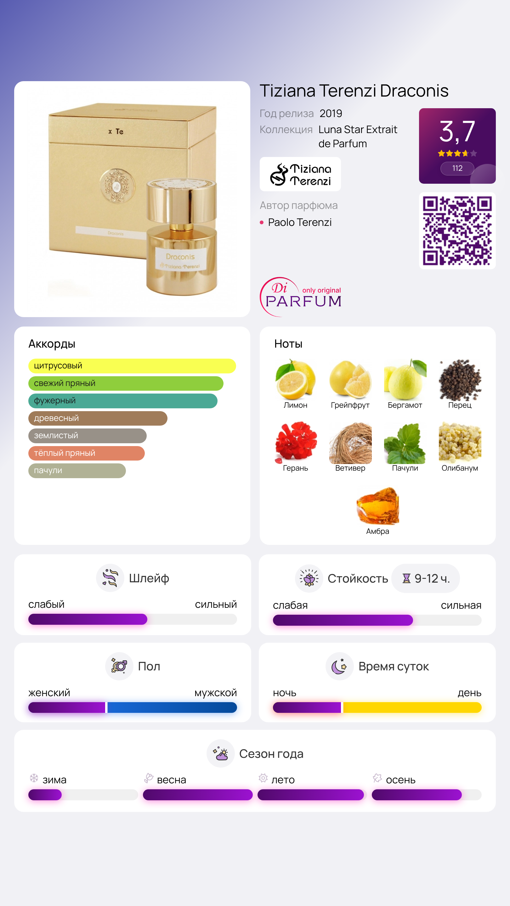 Здесь тёплые амбровые оттенки, пряные землистые пачули, травянистый ветивер и смолистый олибанум формируют впечатляющий и стойкий шлейф. Освежающая, тёплая и пикантная природа парфюма Tiziana Terenzi Draconis произведёт положительное впечатление на окружающих и поднимет настроение благодаря своему жизнеутверждающему звучанию.