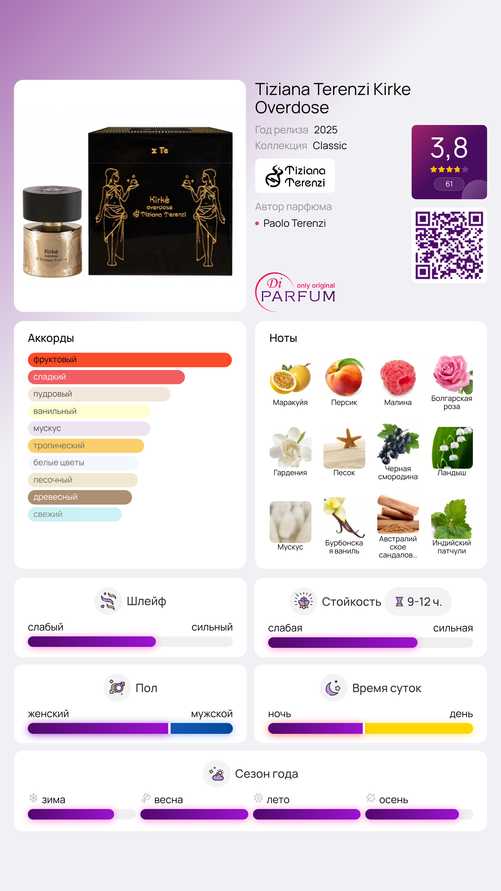 Kirke Overdose от Tiziana Terenzi — это удивительный аромат, который подходит как для женщин, так и для мужчин. Этот парфюм был представлен в 2025 году и является новым в коллекции бренда. За созданием этого аромата стоит известный парфюмер Паоло Теренци, который сумел воплотить в нем множество ярких и насыщенных нот.