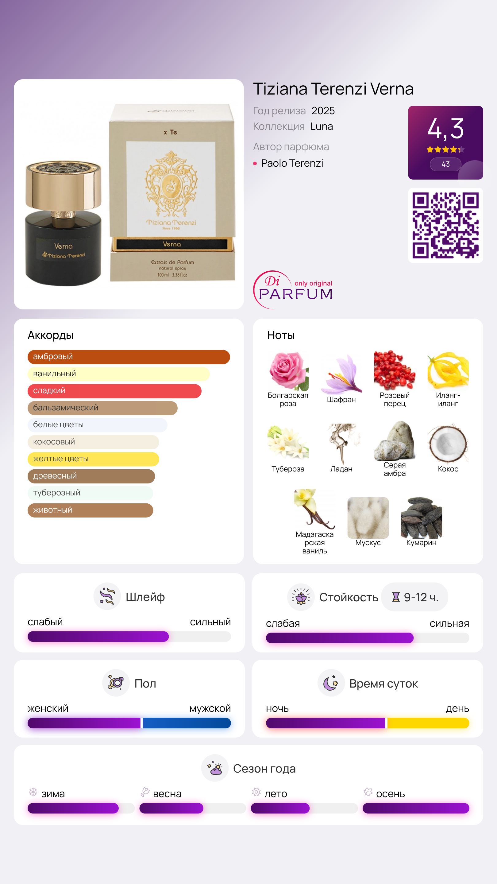 Verna от Tiziana Terenzi – это восточно-цветочный аромат, созданный как для женщин, так и для мужчин. Этот новый аромат был представлен в 2025 году, и его автором выступил парфюмер Паоло Теренци. В верхних нотах мы чувствуем благоухание болгарской розы, розового перца и шафрана, которые сразу же погружают вас в атмосферу сказочного места.