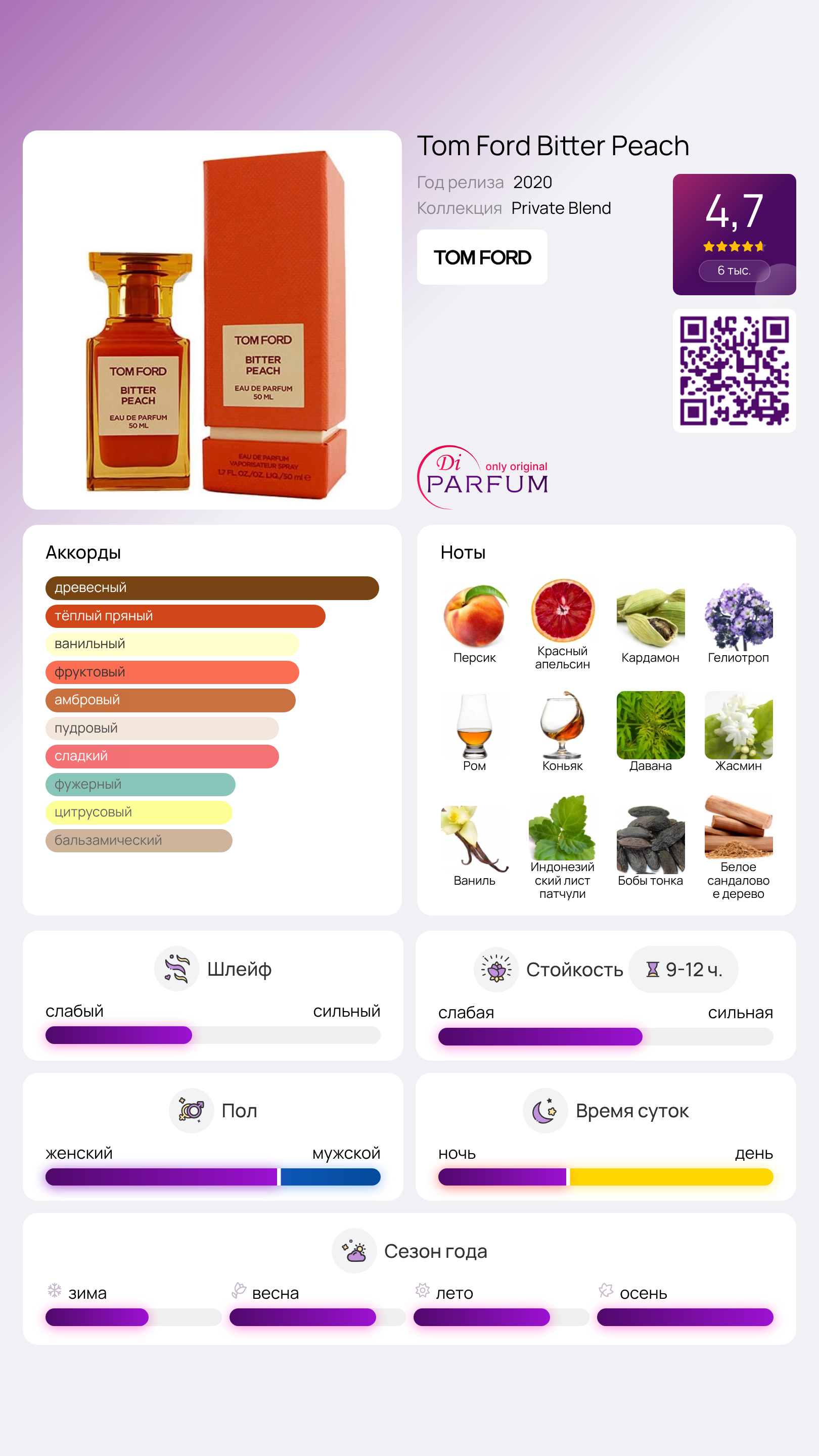 Tom Ford Bitter Peach – это аромат, который не подходит для официальных мероприятий. Он является настоящим ритуальным аксессуаром для интимных вечерних встреч вдвоем.