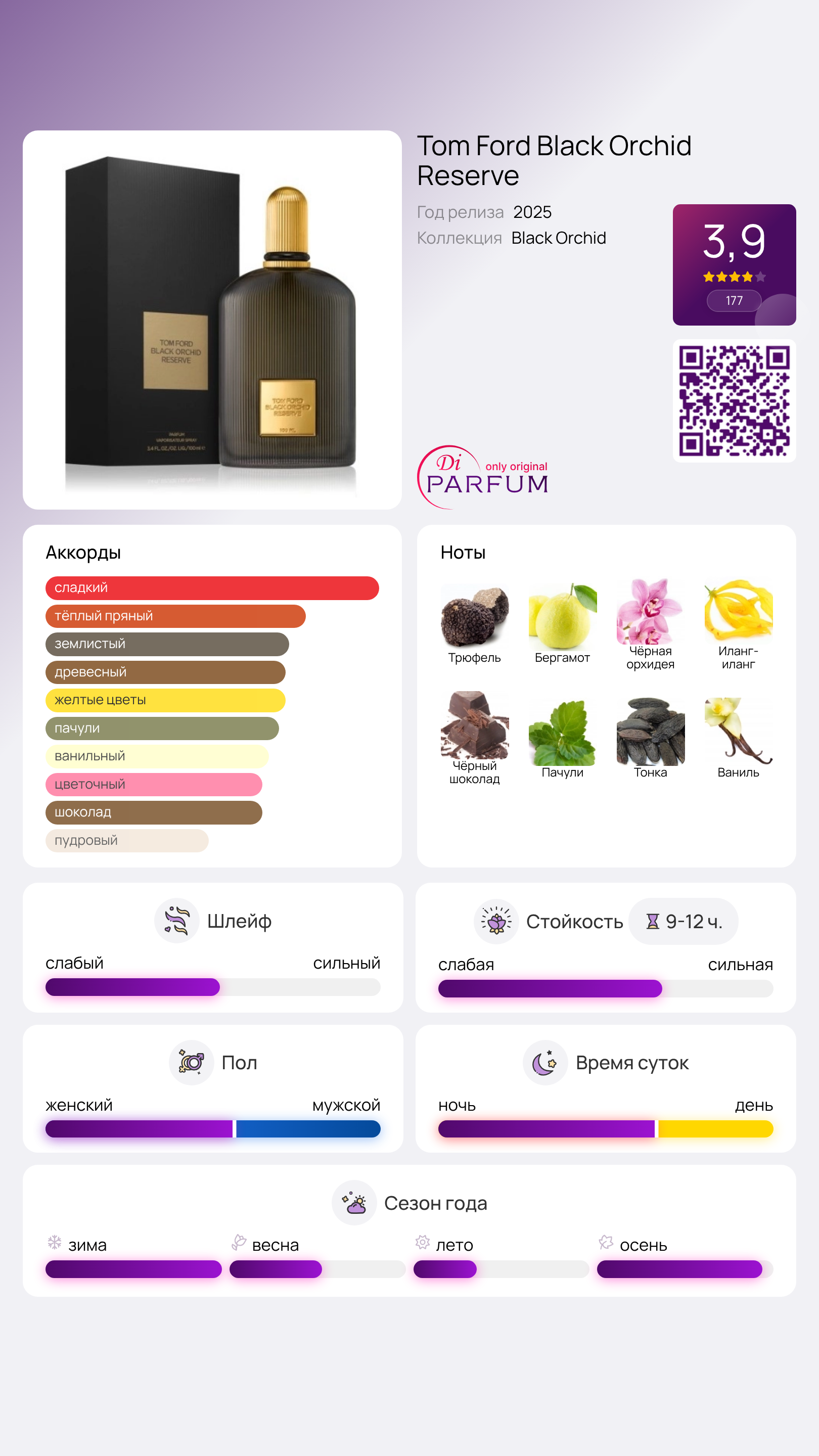 Black Orchid Reserve — это не просто аромат, это воплощение смелости и утонченности, идеально подходящее как для повседневного использования, так и для особых случаев. Его уникальная композиция порадует истинных ценителей парфюмерного искусства и станет настоящей находкой для коллекционеров.