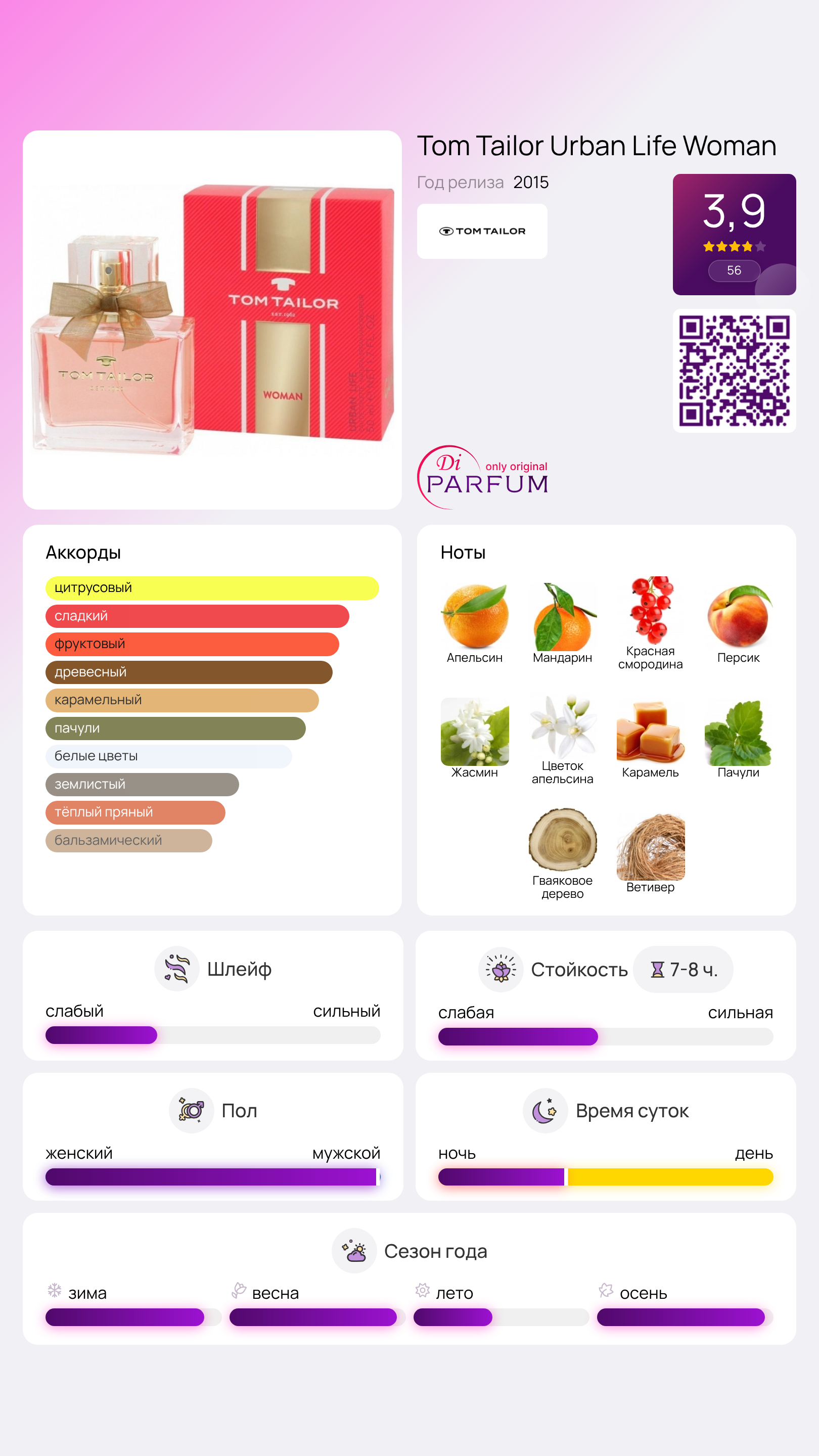 Tom Tailor Urban Life Woman представляет собой яркий и харизматичный цветочно-фруктовый парфюм, который отражает динамичную атмосферу современного мегаполиса. Этот аромат создан для женщин, уверенных в себе, которые стремятся к новым эмоциям, при этом сохраняя свою элегантность и женственность.