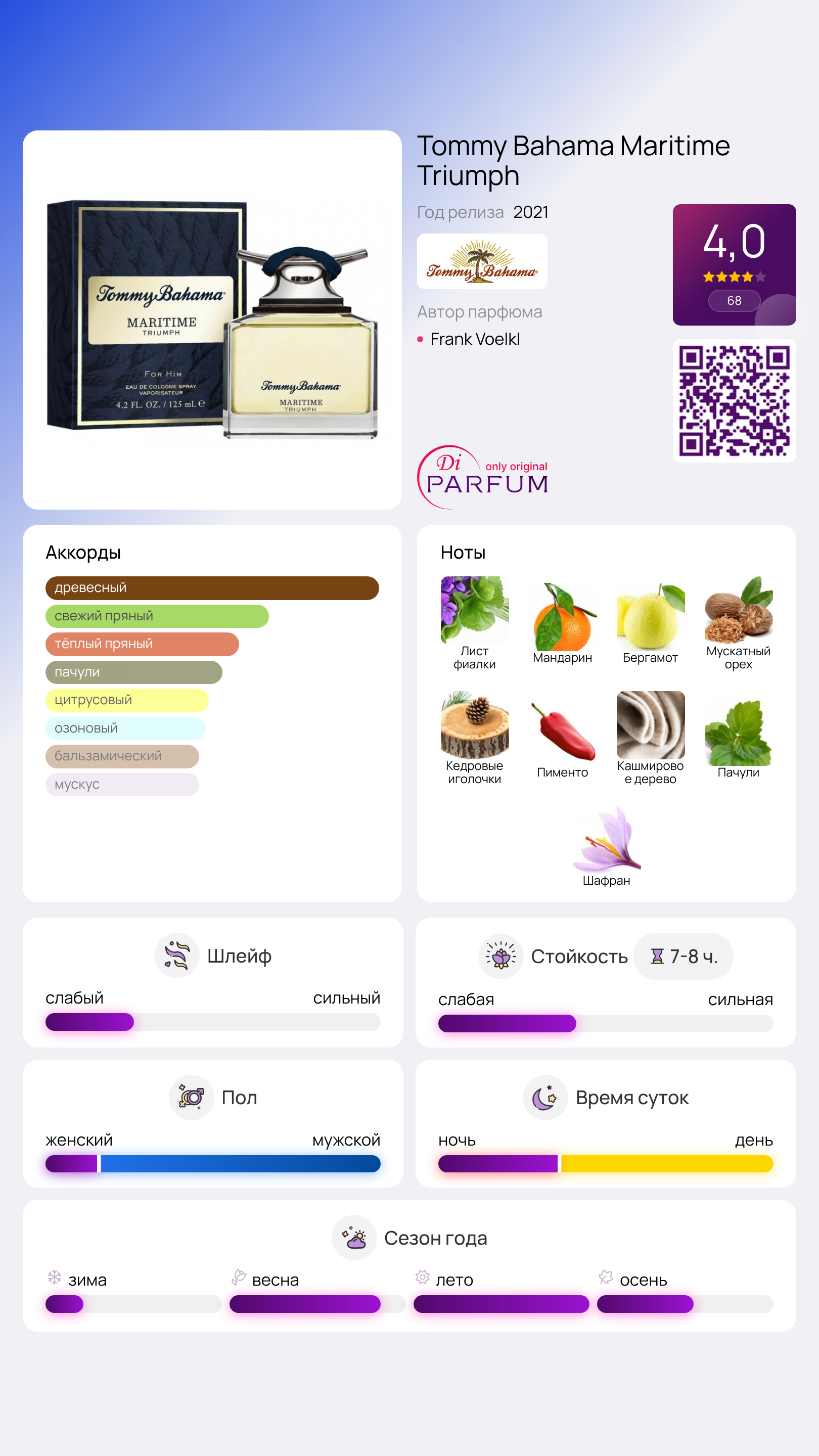 Завершение представлено насыщенным и глубоким шлейфом, в котором гармонично переплетаются ноты пачули, кашемирового дерева и шафрана, образуя многогранный и тёплый след. Tommy Bahama Maritime Triumph – это элегантный и стильный выбор, идеально подходящий как для деловых встреч, так и для повседневных или романтических образов мужчины, подчеркивая его лучшие качества в любой ситуации.