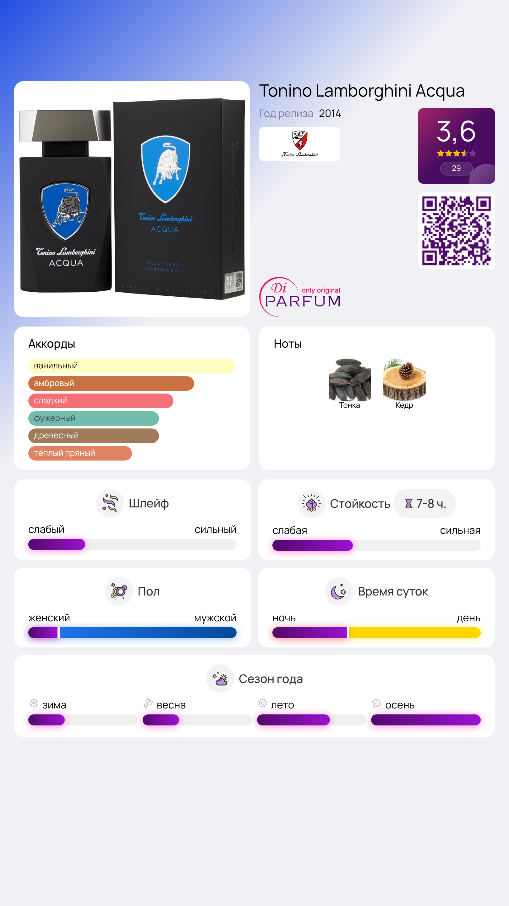 Незабываемый шлейф аромата окутывает тело смолистыми нотами кедра и сандала, создавая глубокое и притягательное звучание, дополненное лёгким облаком бобов тонка. Туалетная вода Acqua от Tonino Lamborghini олицетворяет успешного спортивного мужчину, подчеркивая его высокий статус и лидерские качества, присущие основателям бренда.
