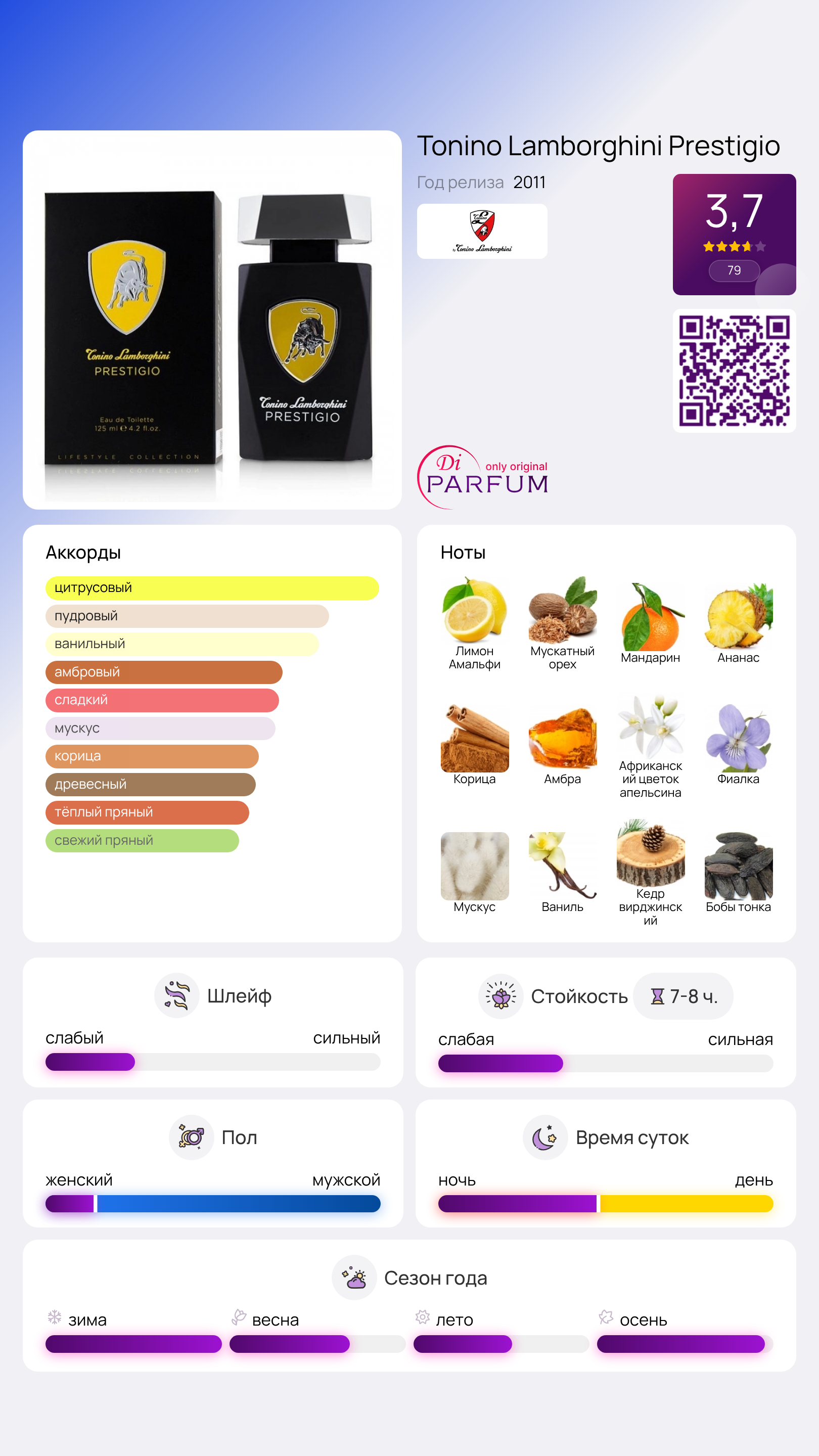 Prestigio от Tonino Lamborghini — это Восточно-пряный аромат для мужчин, выпущенный в 2011 году. В верхних нотах вы почувствуете Амальфитанский лимон, мускатный орех, мандарин и ананас. Сердце аромата наполнено корицей, амброй, африканским апельсиновым цветом и фиалкой, а базовые ноты представляют собой притягательную комбинацию ванили, мускуса, виргинского кедра и бобов тонка.