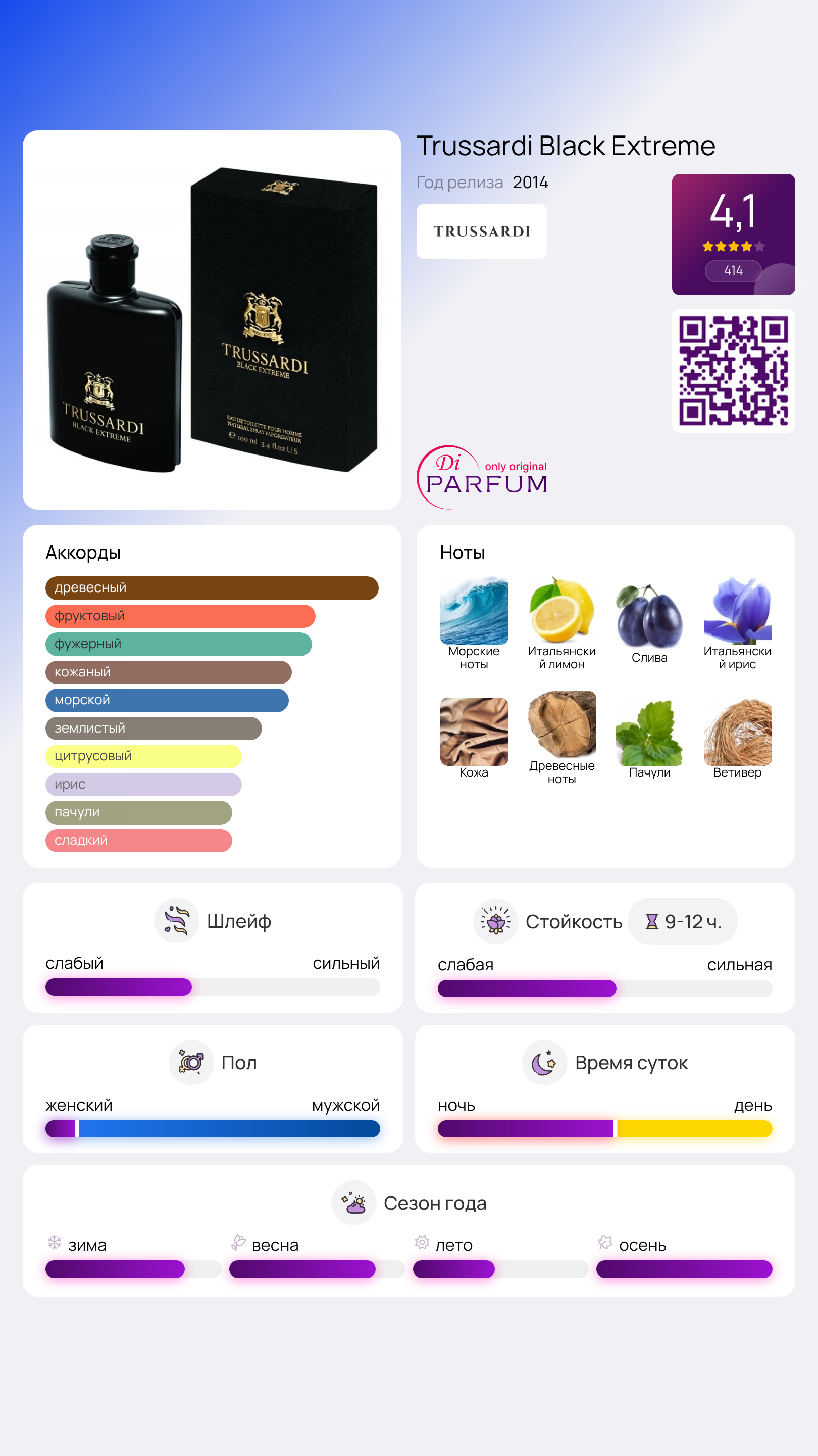 В верхних нотах ощущаются нотки свежего итальянского бергамота, дополняемые солоноватыми морскими акцентами. Сердце композиции раскрывает элегантное сочетание сливы и ириса, произрастающего в Италии. Завораживающий шлейф формируется благодаря органическому ветиверу, пачуле, кожаным нюансам и древесным нотам, что придаёт аромату особую привлекательность.