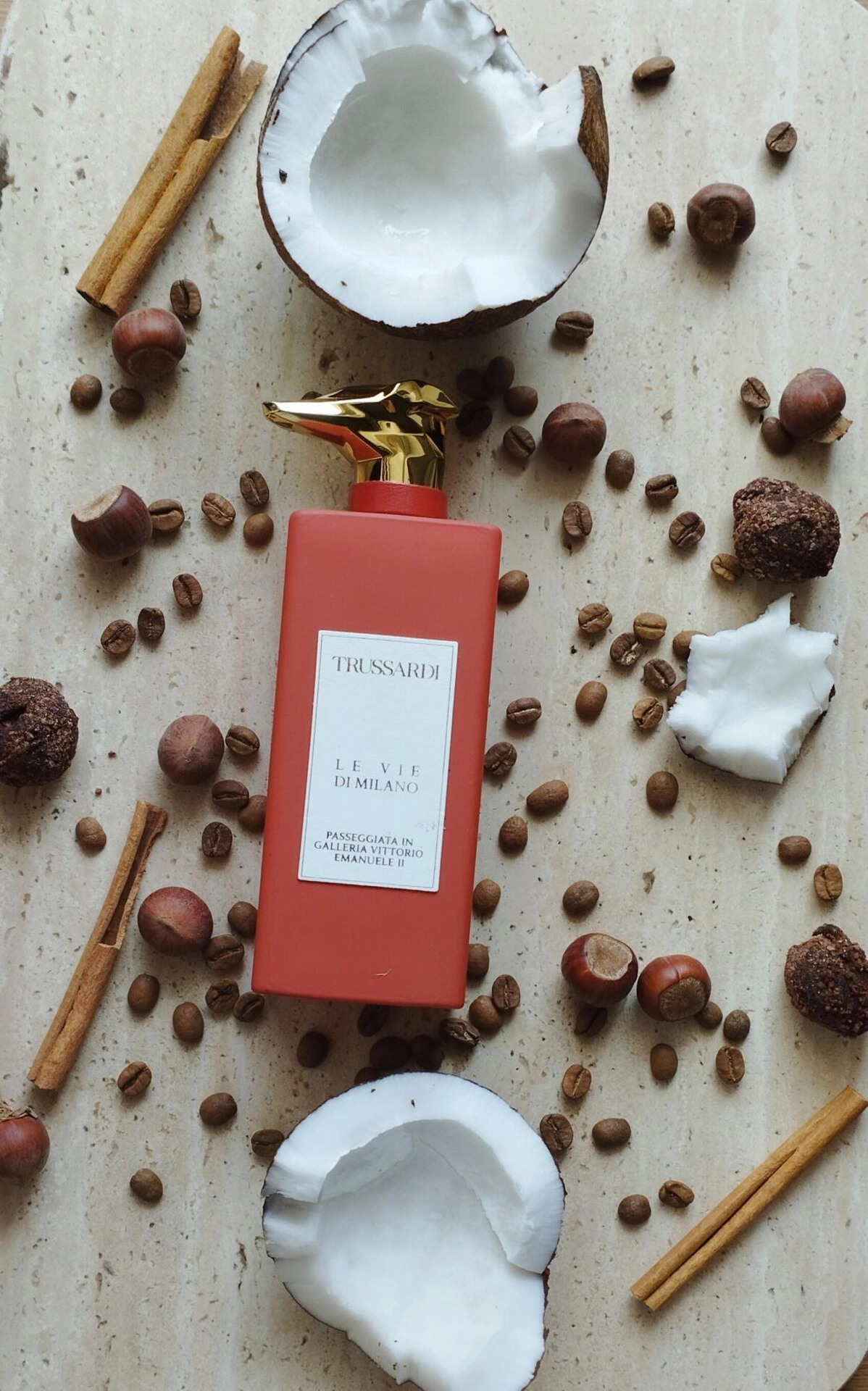 Сначала ощущается насыщенный аромат зерен Lavazza, дополненный пряной теплотой корицы и ореховыми оттенками, словно это чашка свежезаваренного американо, поданная в VIP-зале модного бутика. За этим следует наслаждение от экзотического сладко-сливочного кокоса и нежности белых лепестков жасмина, окрашенных главной героиней — медовой, чувственной и самовлюбленной туберозой. Мускусно-ванильный шлейф TRUSSARDI Passeggiata In Galleria Vittorio Emanuele II уверенно ведет за собой, оставляя благородный и утонченный аромат белого кедра.