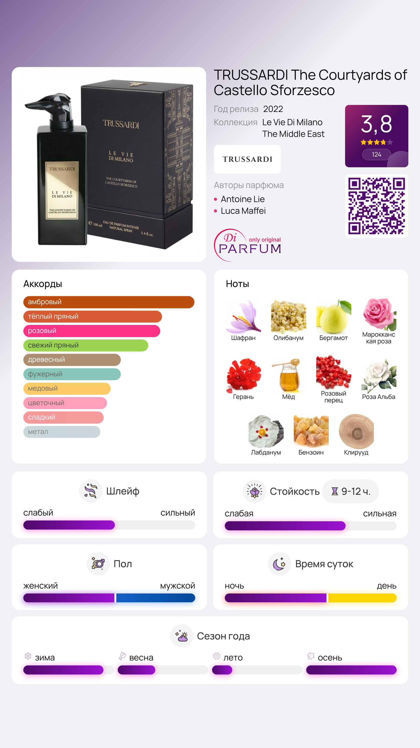 А для повышения стойкости были добавлены синтетические молекулы. Презентация ароматной композиции The Courtyards of Castello Sforzesco от TRUSSARDI состоялась в 2022 году, и она стала изюминкой ближневосточной коллекции. Флакон, выполненный из современного материала zamak, украшен изображением статной борзой в кожаном ошейнике.