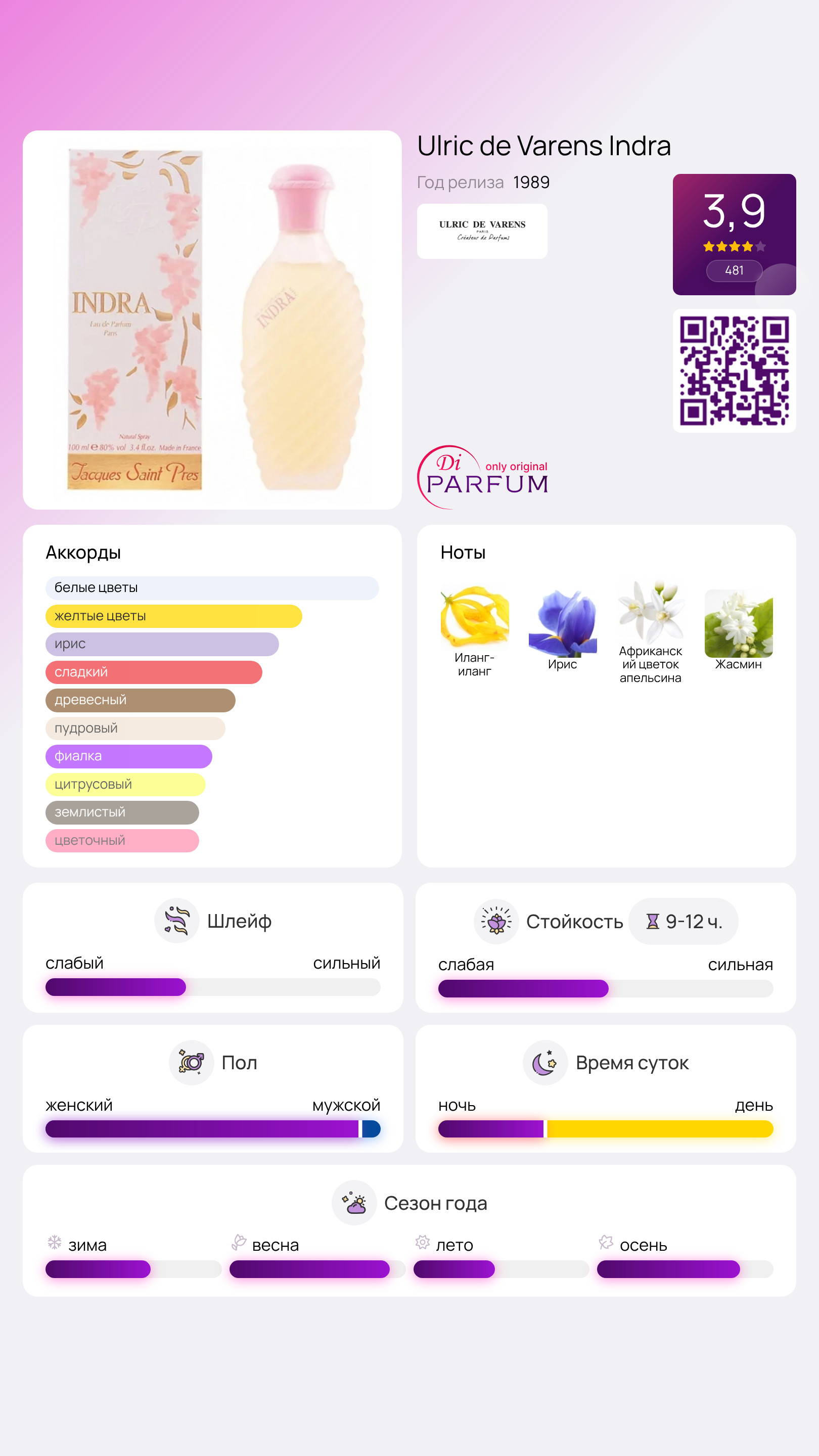 В базе раскрывается пудровый ирис, который смешивается с чувственной амброй, окруженной мускусом и гвоздикой. В зависимости от температуры окружающей среды Ulric de Varens Indra может звучать как ярко и притягательно, так и более сдержанно. Его богатый состав наиболее подойдет для холодного времени года, и он олицетворяет женственность и элегантность, прекрасно дополняя классический образ современной женщины, наполняя его обаянием.