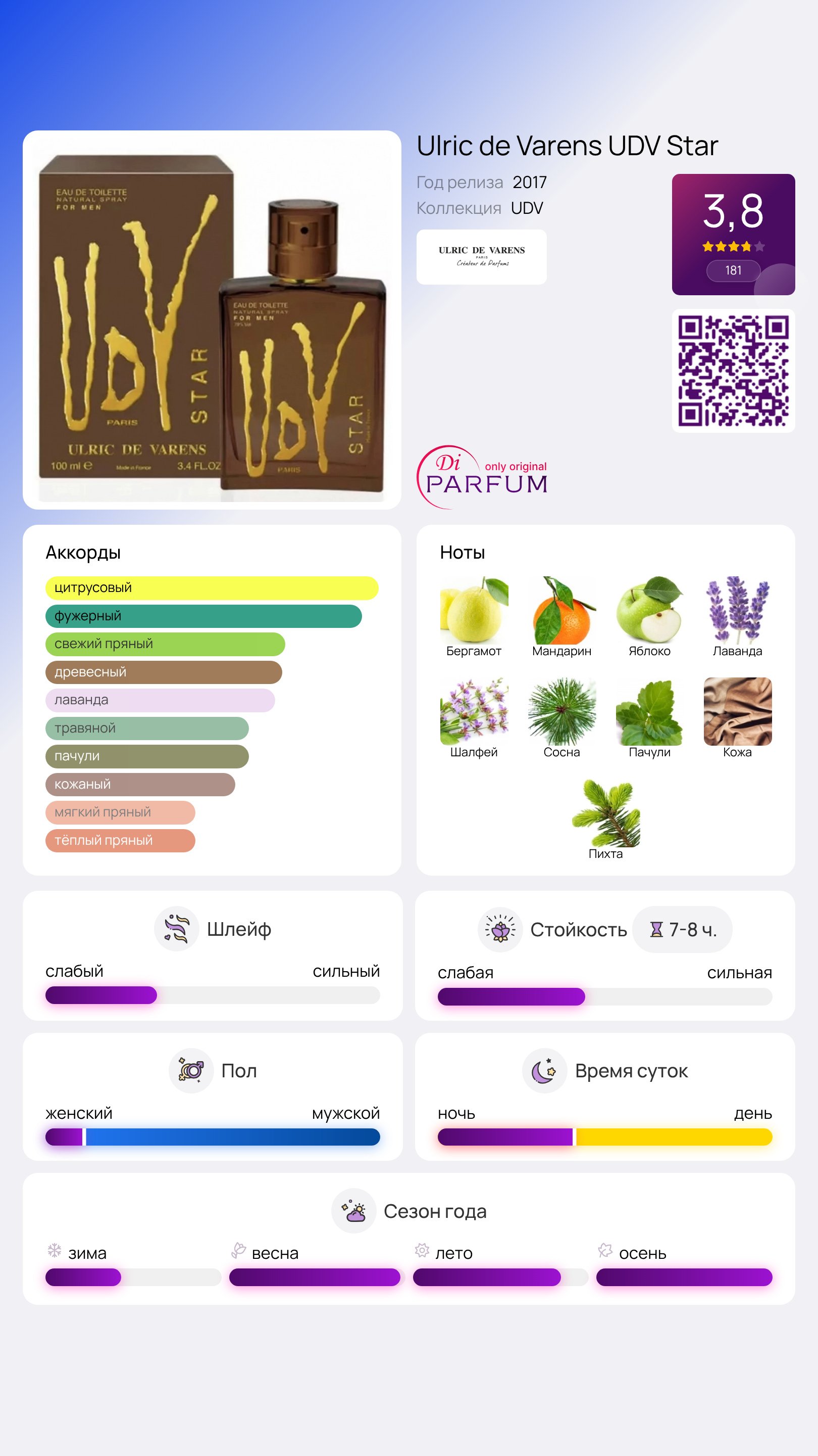 С помощью композиции Ulric de Varens UDV Star вы сможете окунуться в мир радости и изобилия, где все двери откроются перед вами благодаря вашему статусу настоящей звезды. Флакон парфюма выполнен в привлекательном шоколадном цвете с крупными золотыми надписями, что делает его еще более желанным.