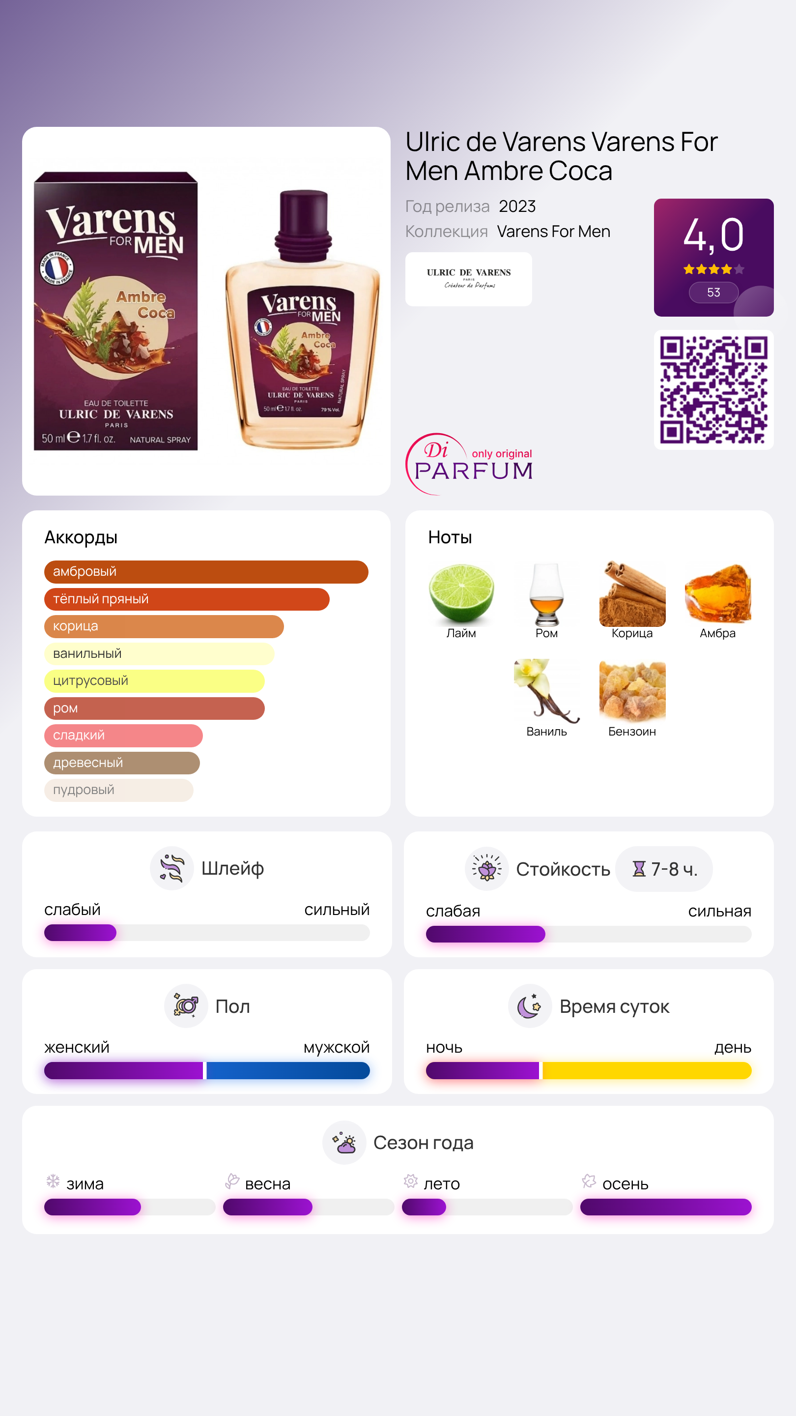 Потрясающая композиция Varens For Men Ambre Coca от Ulric de Varens была выпущена популярным французским брендом в 2023 году. Этот парфюм стал частью «мужской» линии и был признан образцом оптимального соотношения цены и качества. Хотя он позиционируется как мужской, многие пользователи выделяют его как «унисекс». Флакон выполнен в строгом минималистском стиле, а на этикетке изображены основные компоненты аромата.