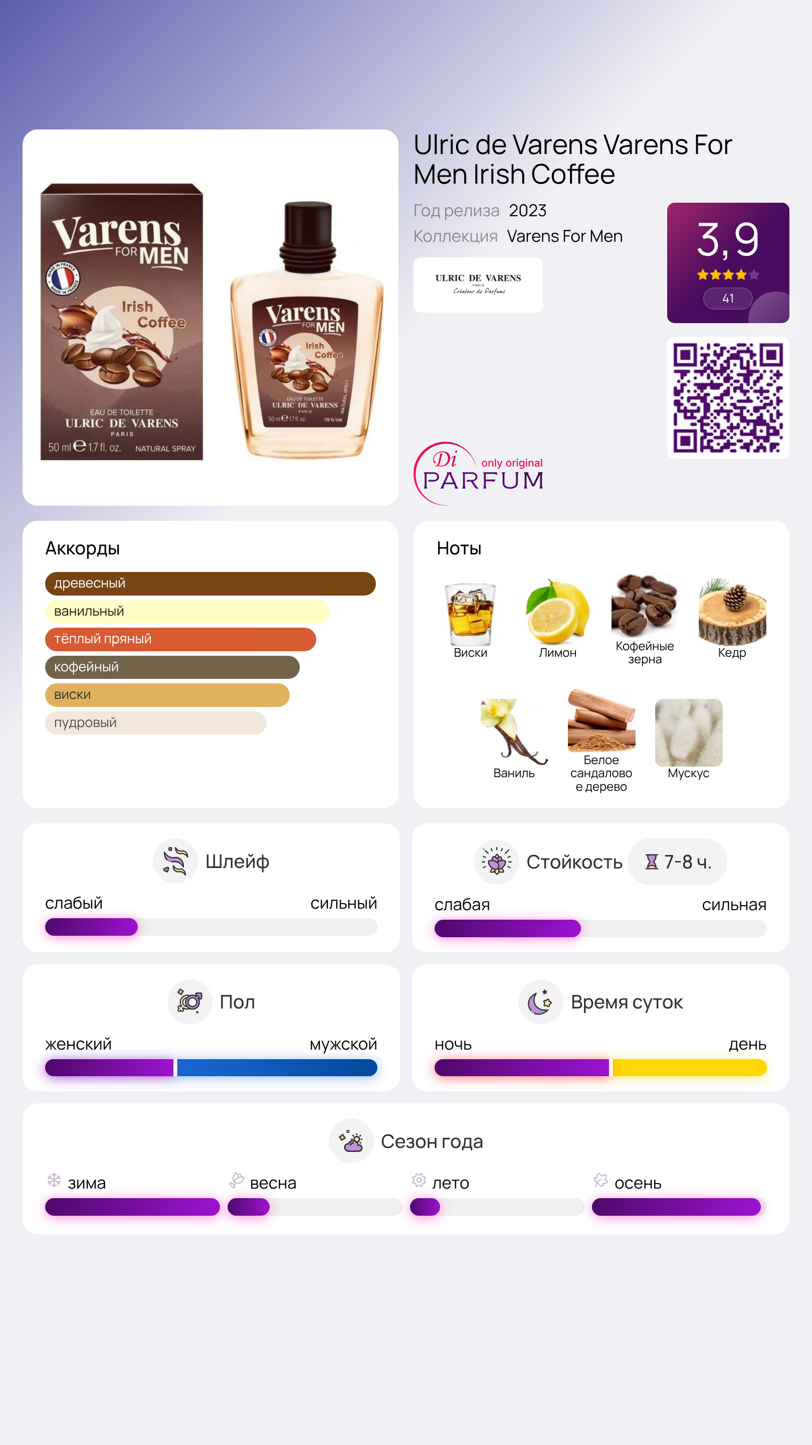 Varens For Men Irish Coffee от Ulric de Varens, вдохновленный классическим Ирландским Кофе, ориентирован на мужчин, готовых к экспериментам и новым ощущениям. Эти духи были выпущены в 2023 году в рамках доступной «мужской» линейки бренда. Флакон привлекает своим минималистичным дизайном.