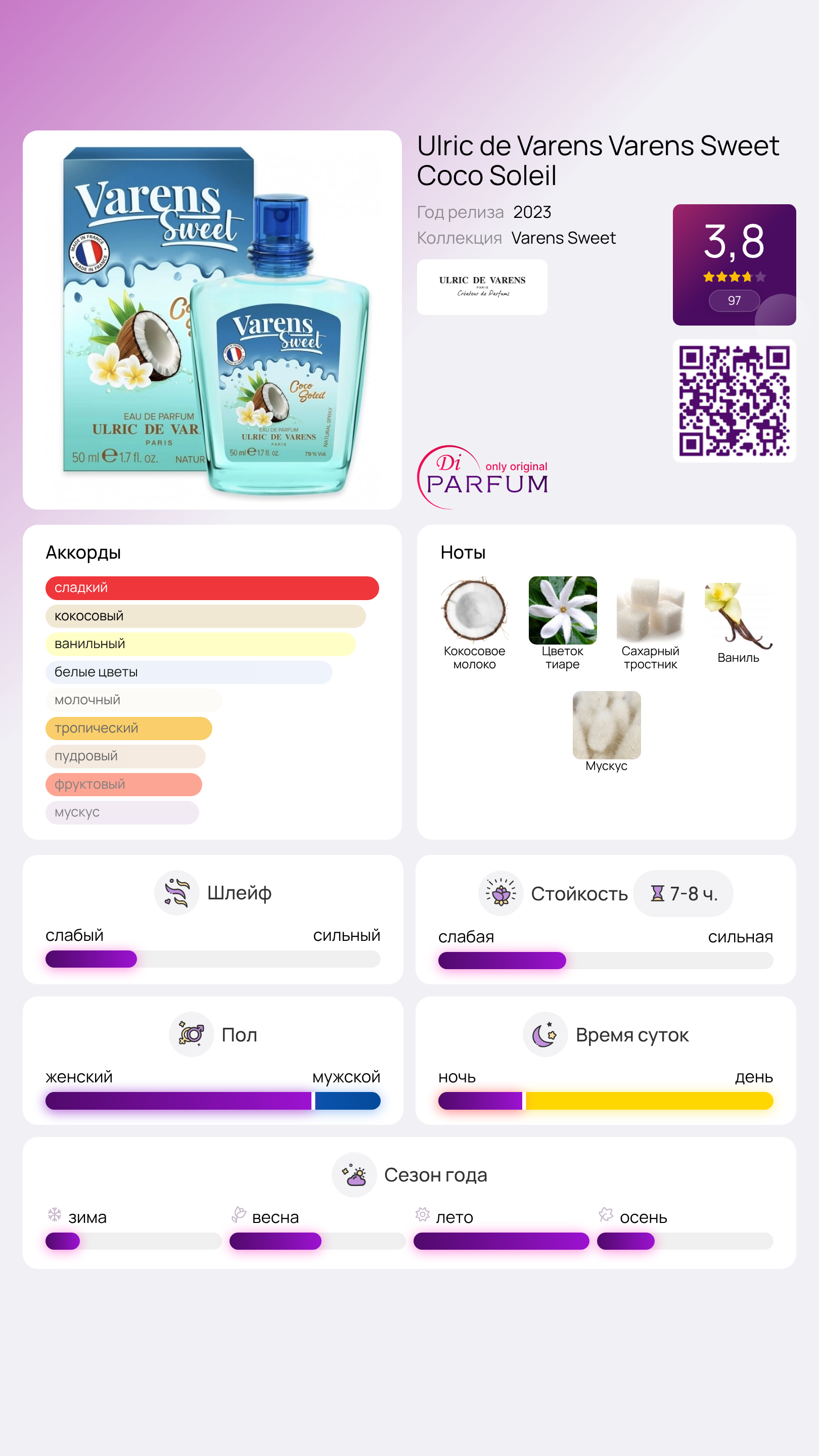 Аромат Varens Sweet Coco Soleil обладает консистенцией, напоминающей густую карамель. Этот насыщенный запах от Ulric de Varens становится истинным примером гурманского чувства, ассоциируясь с отдыхом. Данная туалетная вода была выпущена в 2023 году бюджетным французским брендом в рамках их «сладкой» коллекции. Бирюзовый флакон с изображениями ключевых ингредиентов вызывает ассоциации с прекрасными пляжами."