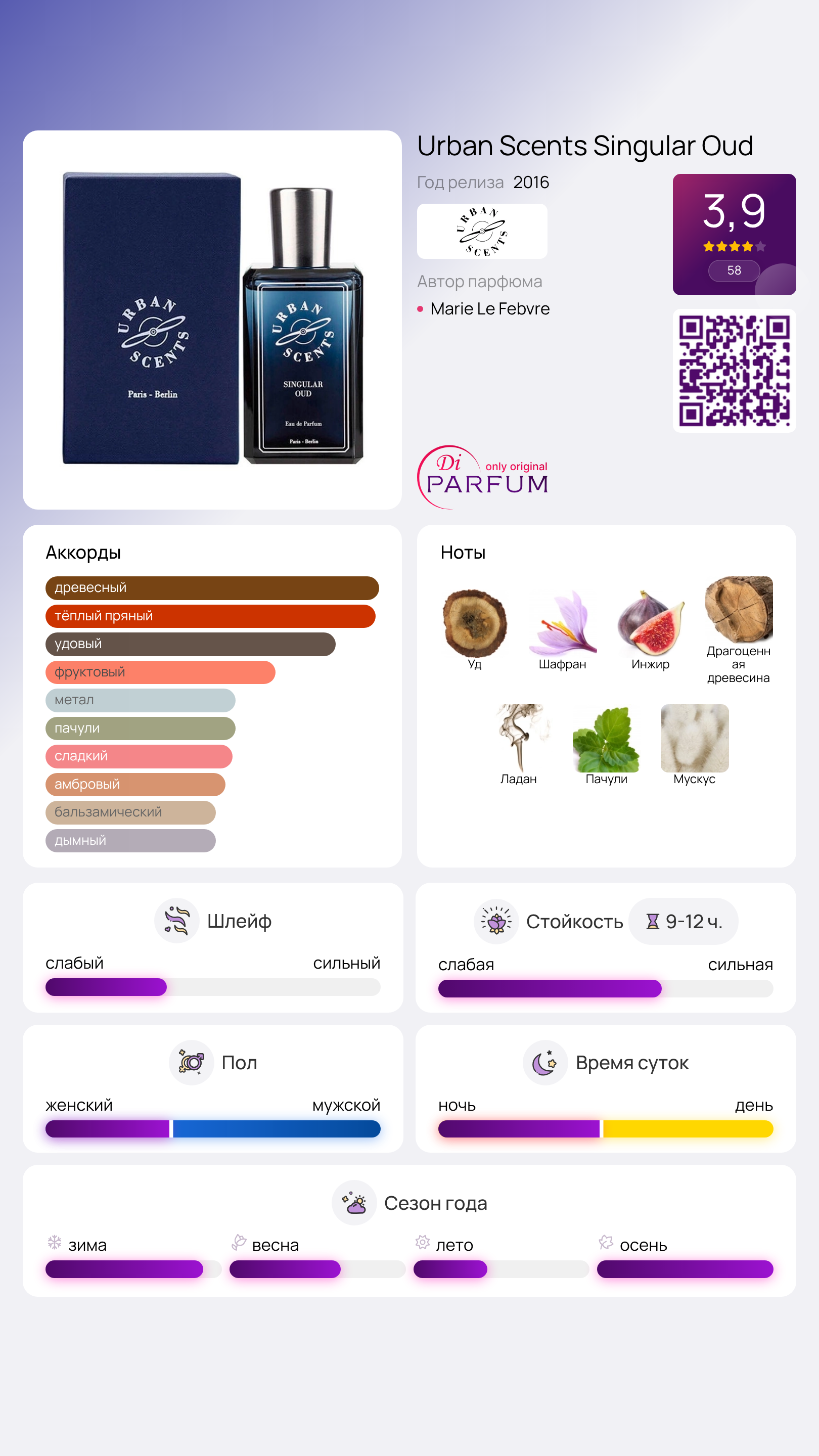 Глубокие древесные ноты звучат как стружка от древесины, а стойкий шлейф напоминает стиль Тома Форда, поддерживаясь горьковатыми пачули. Аромат Singular Oud от Urban Scents посвящен одиннадцати мостам, соединяющим Восток и Запад. Это облагораживающий эликсир будет привлекателен даже для тех, кто не является поклонником удовых композиций. Он достоин занять особое место в атмосфере ночного города.