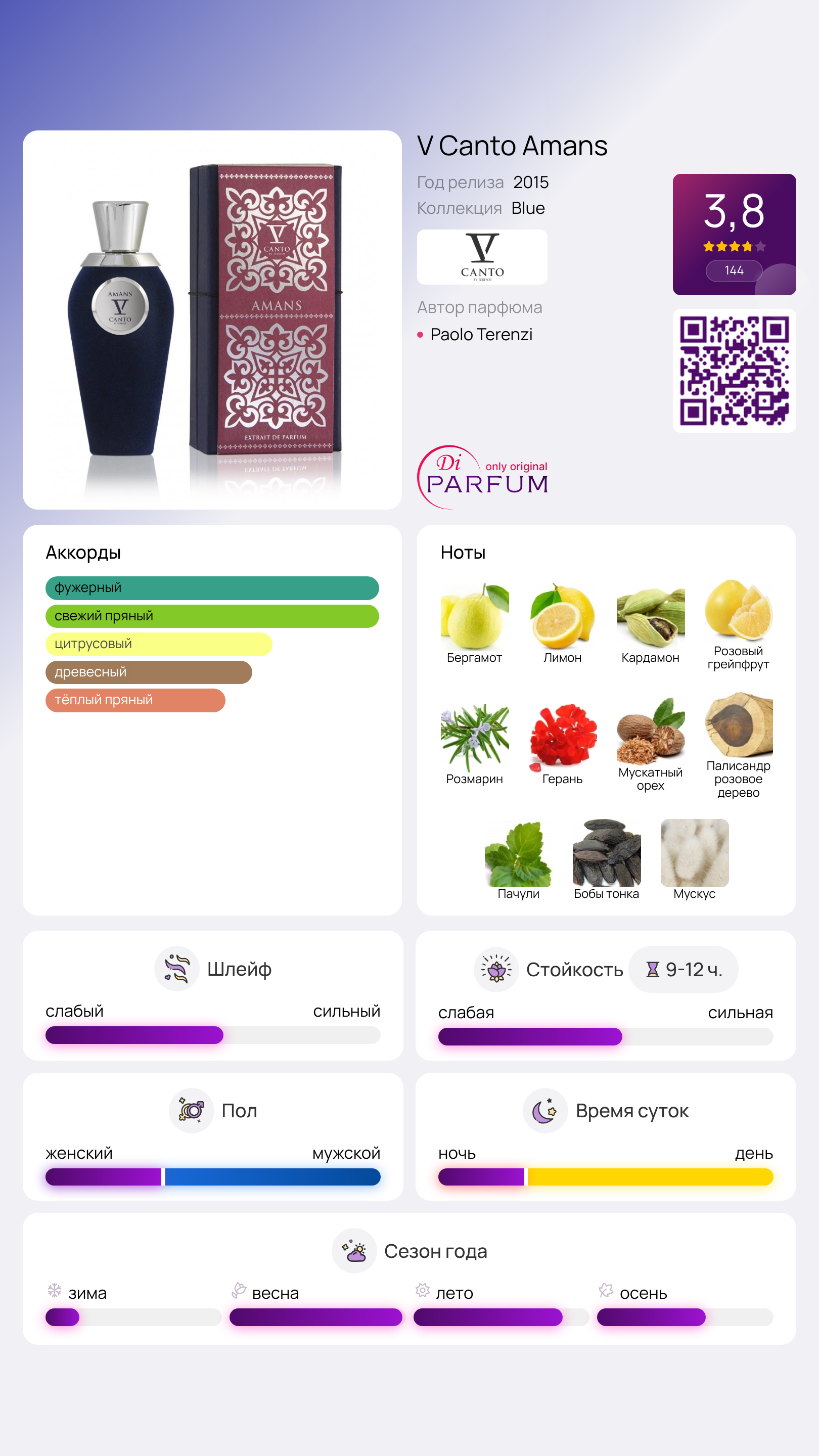 Аромат V Canto Amans, вдохновленный восточной мускусной и цитрусовой тематикой, напоминает о страстном, нежном поцелуе, который заставляет сердца трепетать. Именно «Возлюбленные» являются главными персонажами этого парфюмерного творения, рассчитанного как на женщин, так и на мужчин.