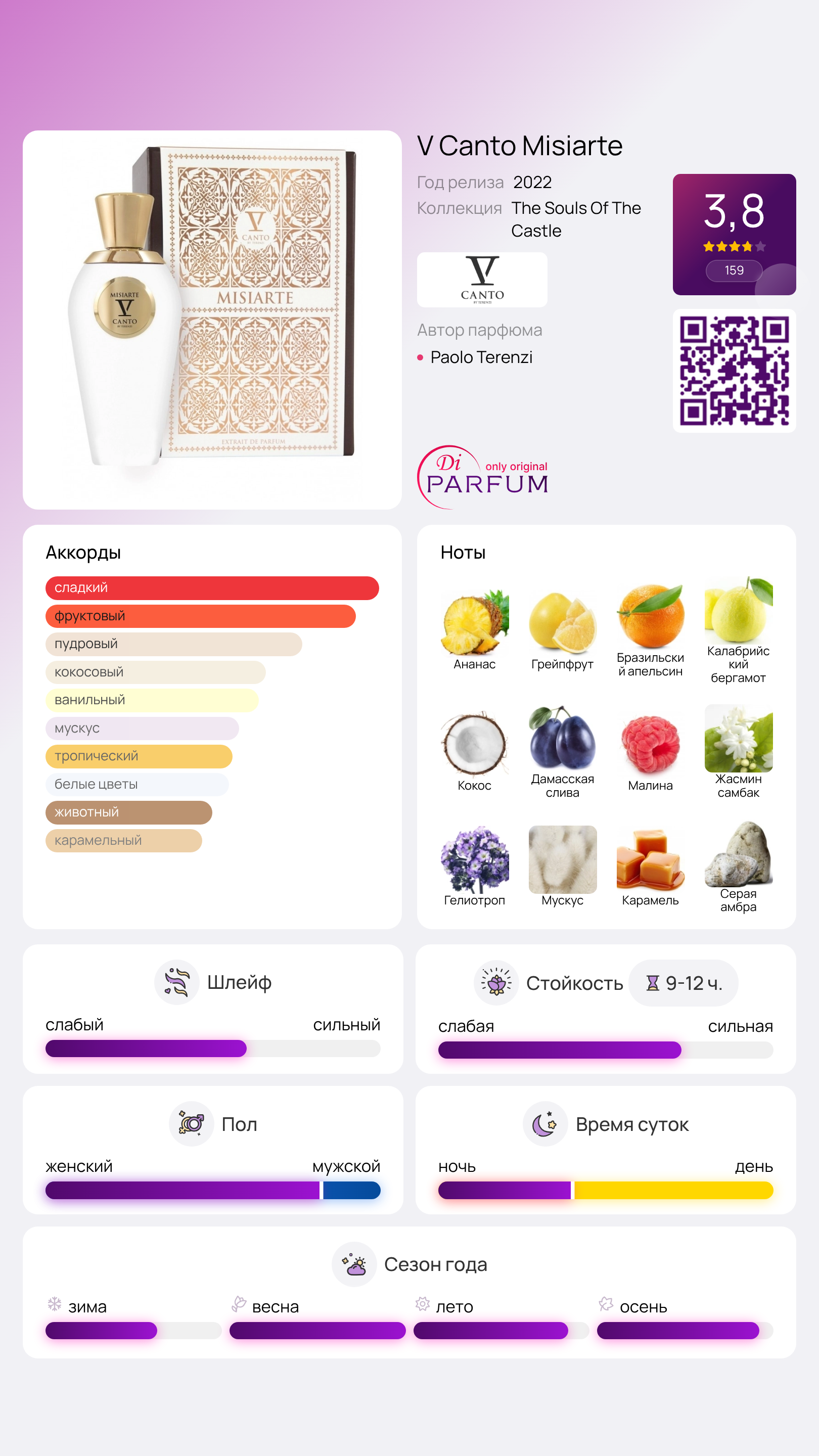 Флоральный восточный аромат V Canto Misiarte является новинкой 2022 года и представляет собой часть парфюмерной палитры. В его состав входят элементы восточных пряностей, гурманских нот, цитрусового освежения, фруктовой сладости, изысканных цветочных оттенков и анималистического кожаного аккорда.