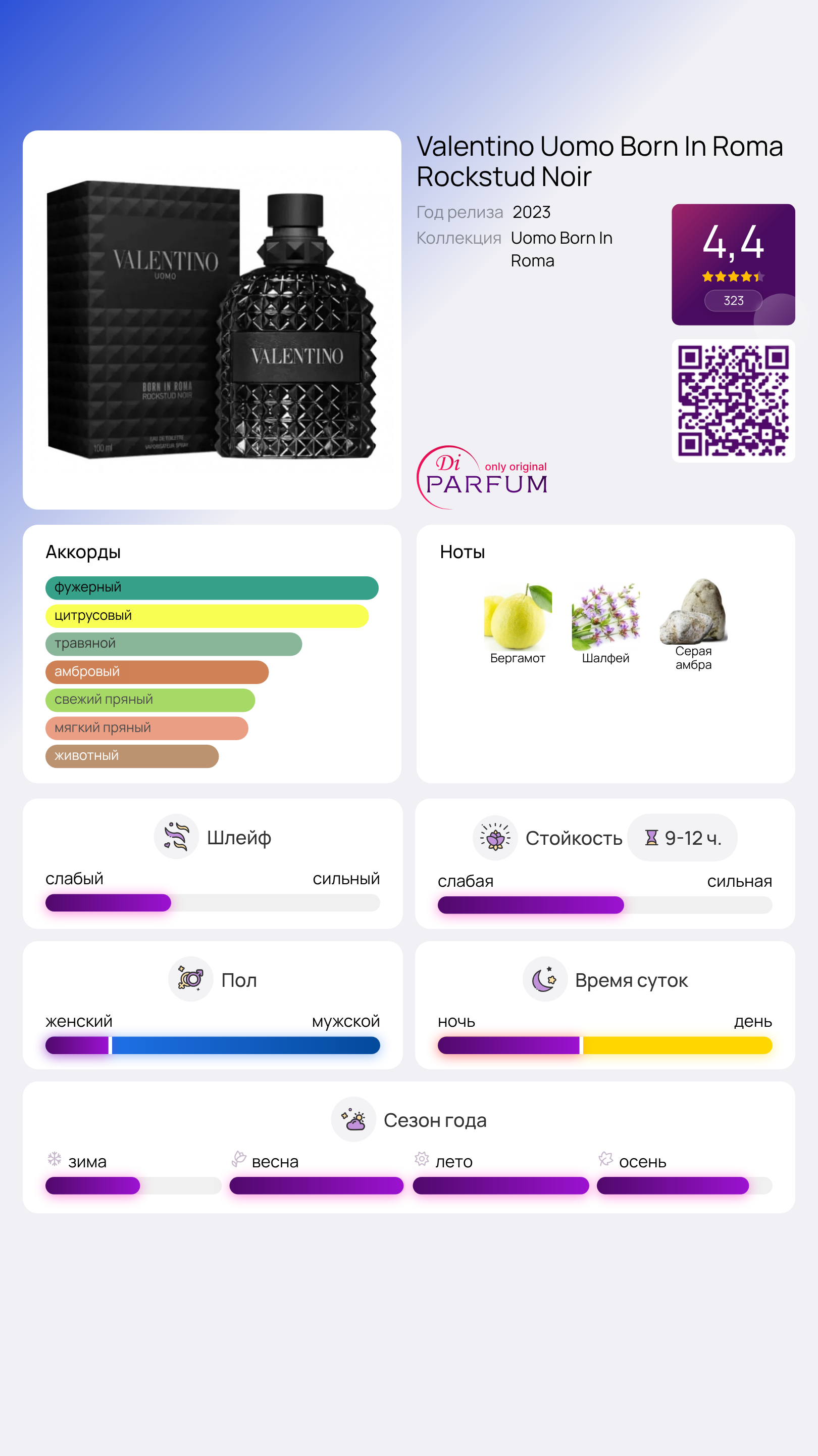 Valentino Uomo Born In Roma Rockstud Noir от Valentino - это ароматическая фужерная композиция для мужчин, запущенная в 2023 году. Верхняя нота представляет собой бергамот, сердечная нота - шалфей, а базовая нота - амбра.