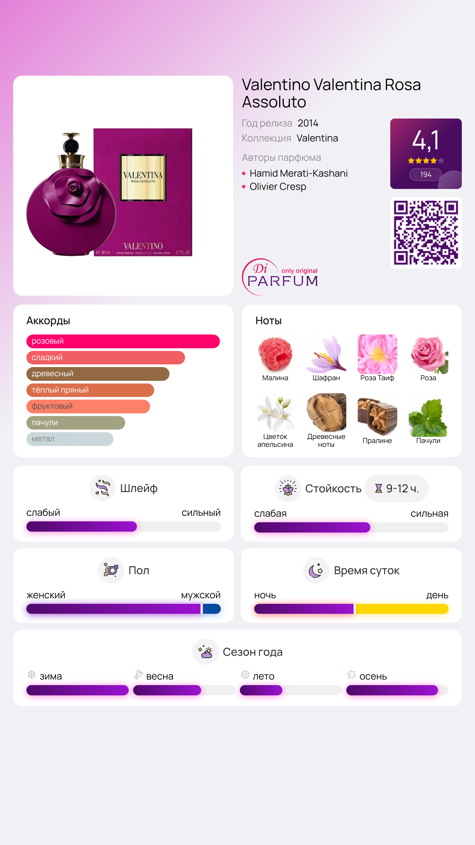 Orient – это постоянный источник вдохновения для парфюмеров и дизайнеров. Новый Valentina Rosa Assoluto отсылает нас к богатству восточных традиций, с его соблазнительным пурпурным флаконом и большой пурпурной цветочной деталью. Аромат стал новым шагом в развитии темы Востока для Valentina, где особое внимание уделено ценному восточному компоненту — розе, что отражает разнообразие и качество восточных ингредиентов.