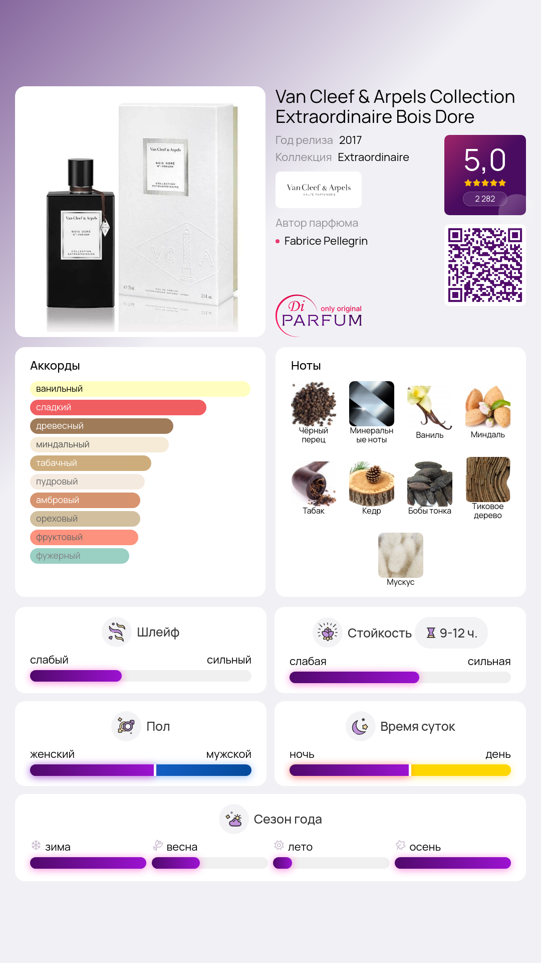 Bois Doré от Van Cleef & Arpels — это восточно-древесный аромат, созданный как для мужчин, так и для женщин. Выпущенный в 2017 году, он стал настоящим открытием для любителей уникальных композиций. За создание этого аромата отвечает талантливый парфюмер Fabrice Pellegrin.