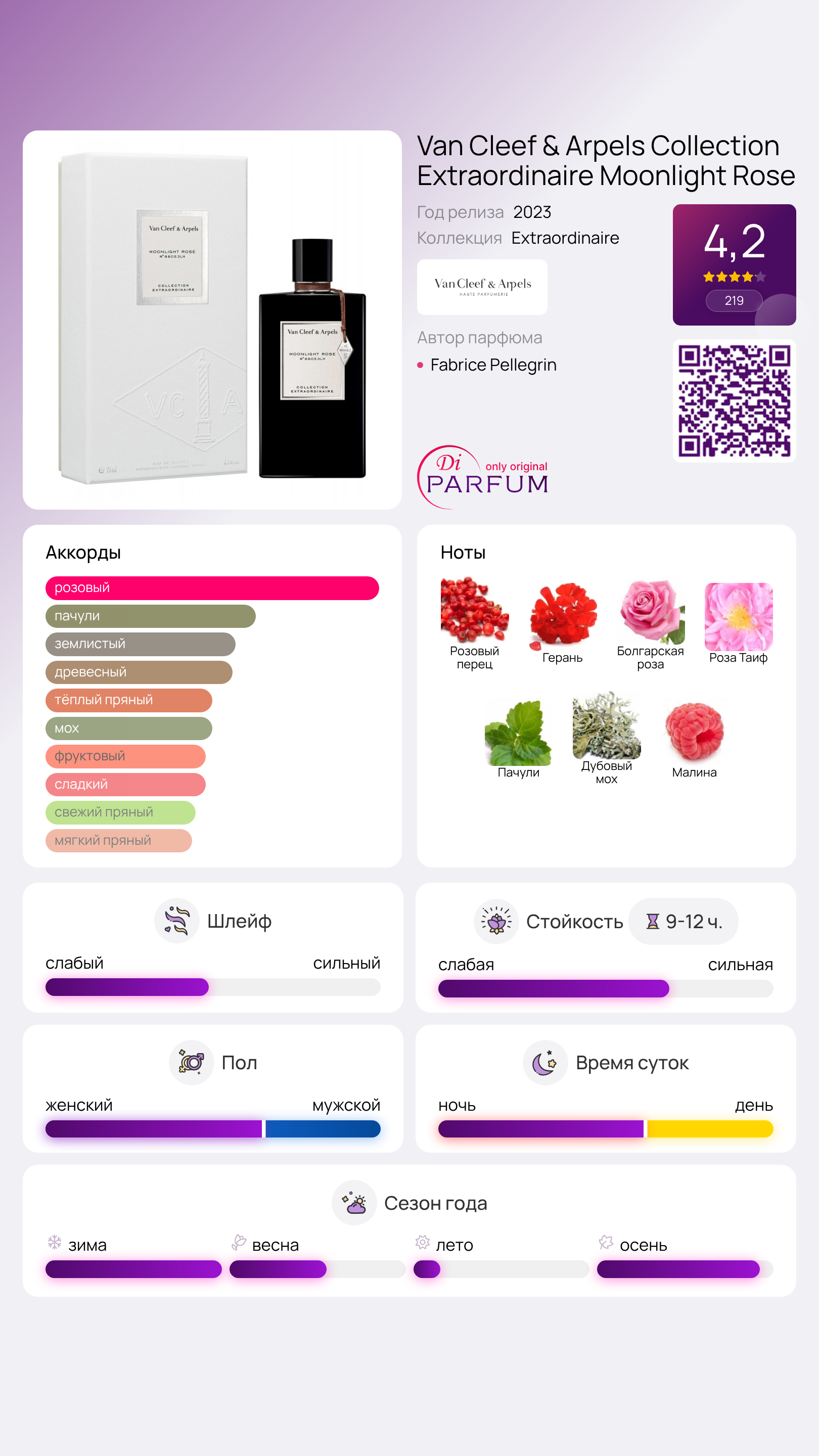 Парфюм Van Cleef & Arpels Collection Extraordinaire Moonlight Rose представляет собой элегантный эликсир с шипровыми и цветочными нотами, который можно ассоциировать с волшебной розой, освещенной луной. В его композиции объединены два вида роз, но цель этих духов заключается не просто в воспроизведении аромата цветка. Парфюмер стремится подчеркнуть его исключительность и уникальность. Этот аромат стал продолжением линейки, начатой в 2016 году.