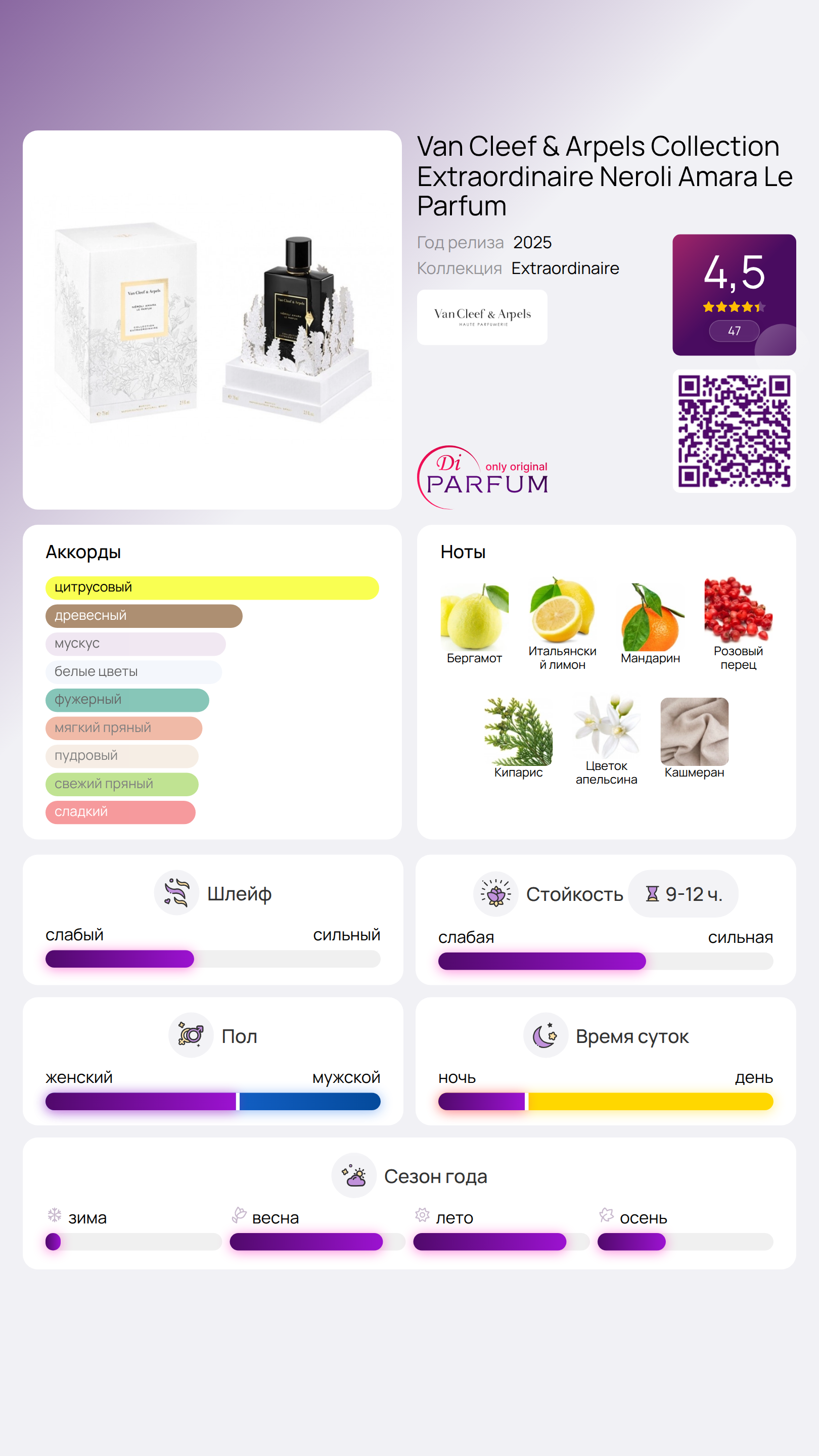 Néroli Amara Le Parfum от Van Cleef & Arpels — это цветочный аромат для женщин и мужчин. Эта новинка была презентована в 2025 году. Верхние ноты аромата включают бергамот, итальянский лимон и мандарин, а сердечные ноты представлены розовым перцем и кипарисом. В базе раскрываются ноты цветка апельсина и кашмерана.
