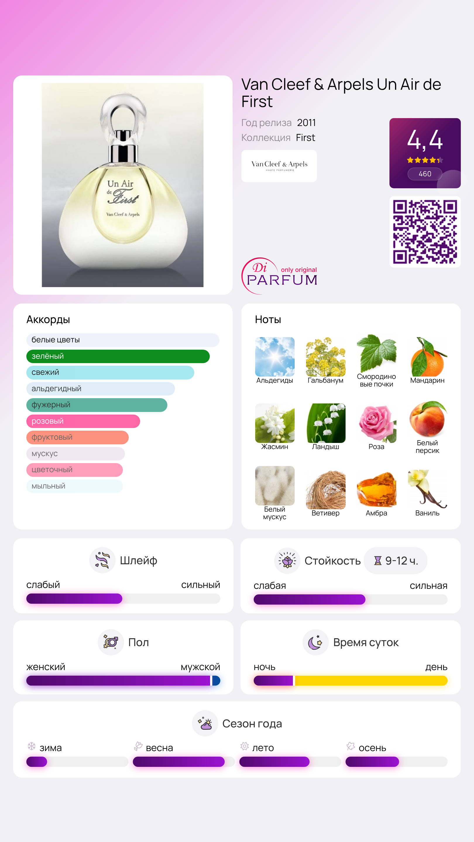 Un Air de First представляет собой современное и яркое переосмысление аромата First. Это легкий и элегантный аромат, который обладает запоминающейся композицией.