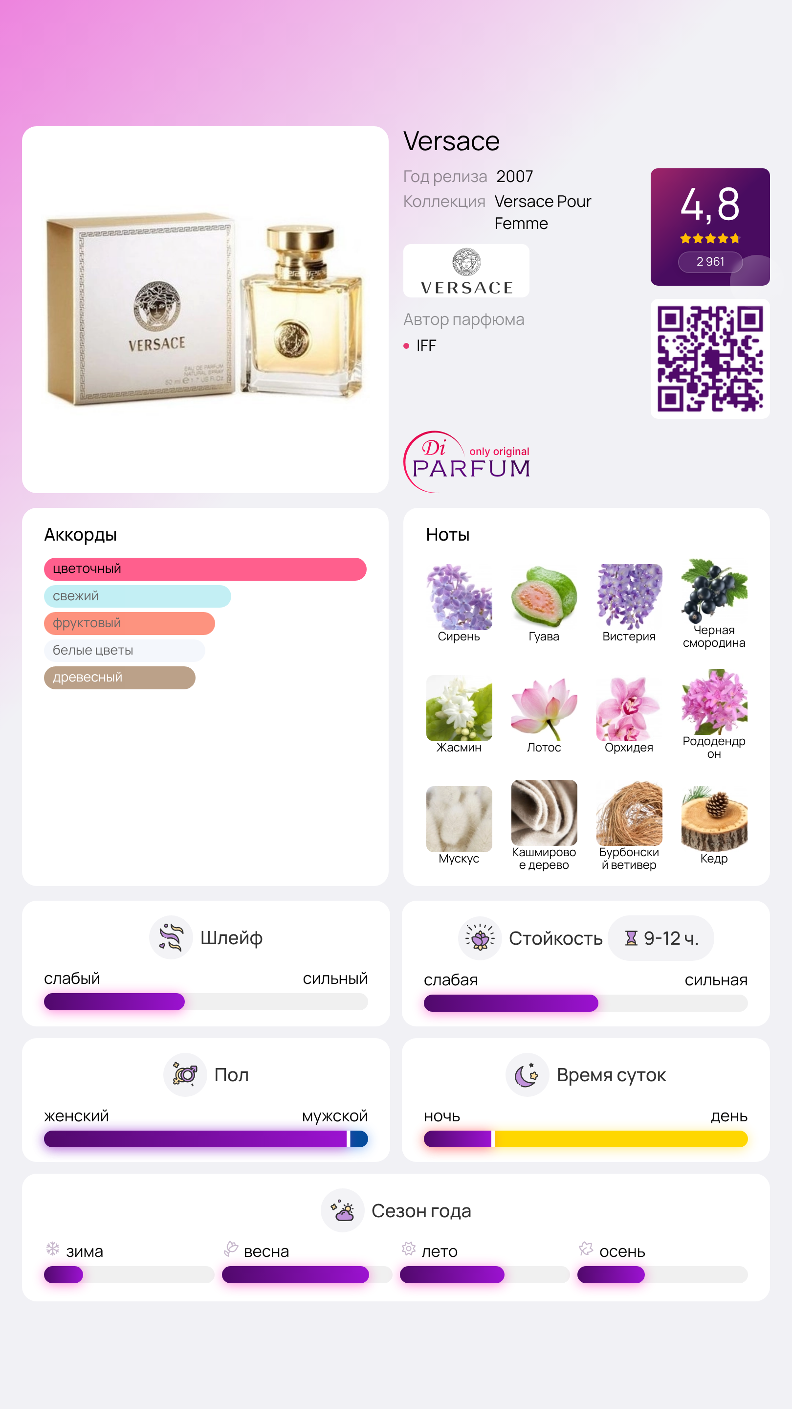 Женский образ – это не просто внешний вид, это нечто большее, что притягивает всех вокруг. И в этом ему помогает аромат от Gianni Versace Versace. Он олицетворяет чувственность и утонченность, обладает притягательной силой и считается уникальным. Можно долго говорить о его характеристиках, но нужно ли это? Этот аромат приносит радость и счастье с каждым вдохом.