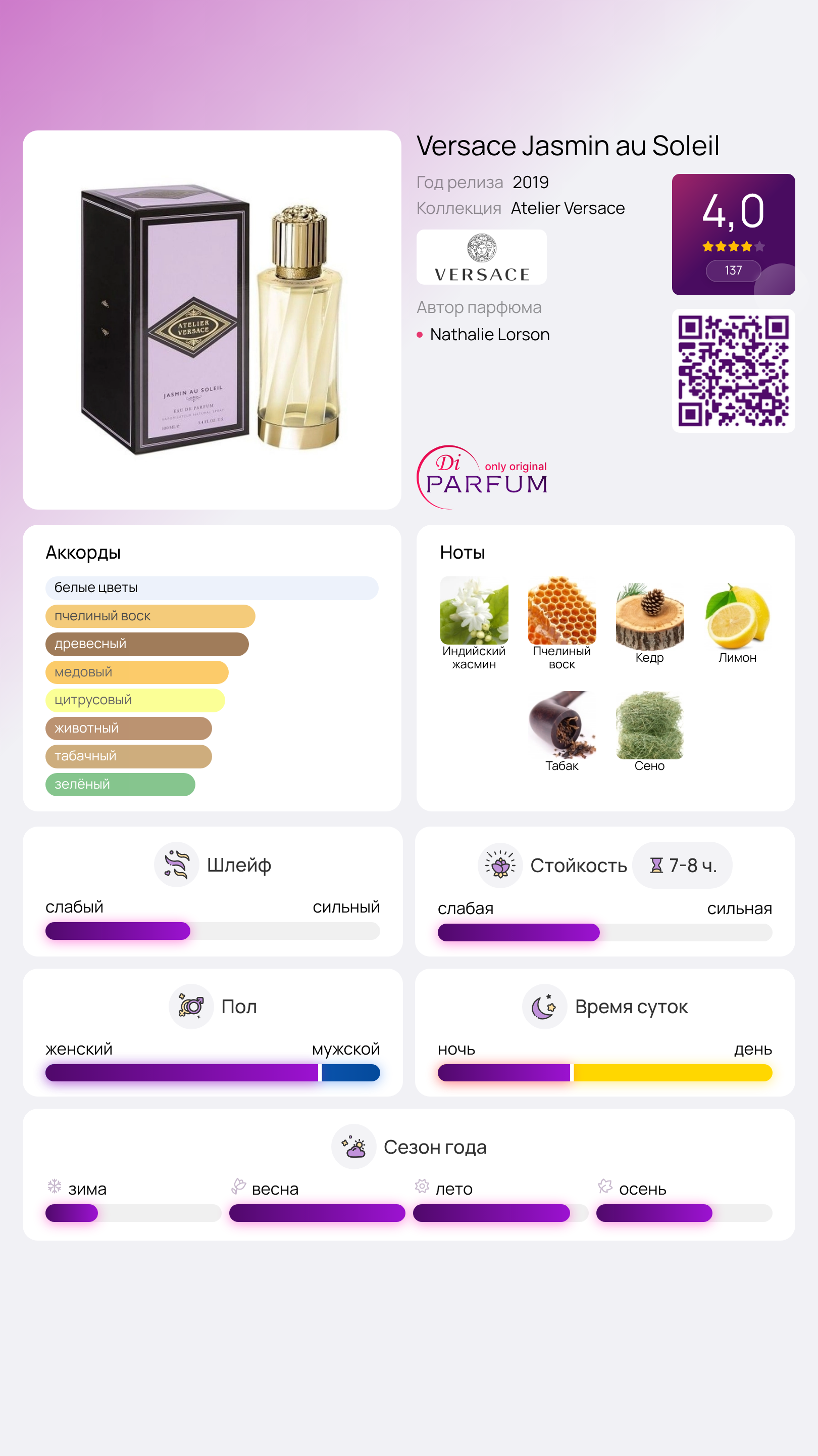 Классический солифлор сливочного жасмина переплетается с тропическими и древесными сладкими нюансами, создавая комфортное и прямолинейное звучание, что привлекает как мужчин, так и женщин. Завершается композиция хвойным и смолистым аккордом кедра, добытого на Аляске. Jasmin au Soleil от Versace был выпущен в 2019 году и является частью линейки Atelier Versace Fragrances. Скульптурный флакон украшен гравировкой логотипа, придавая ему особую атмосферу.