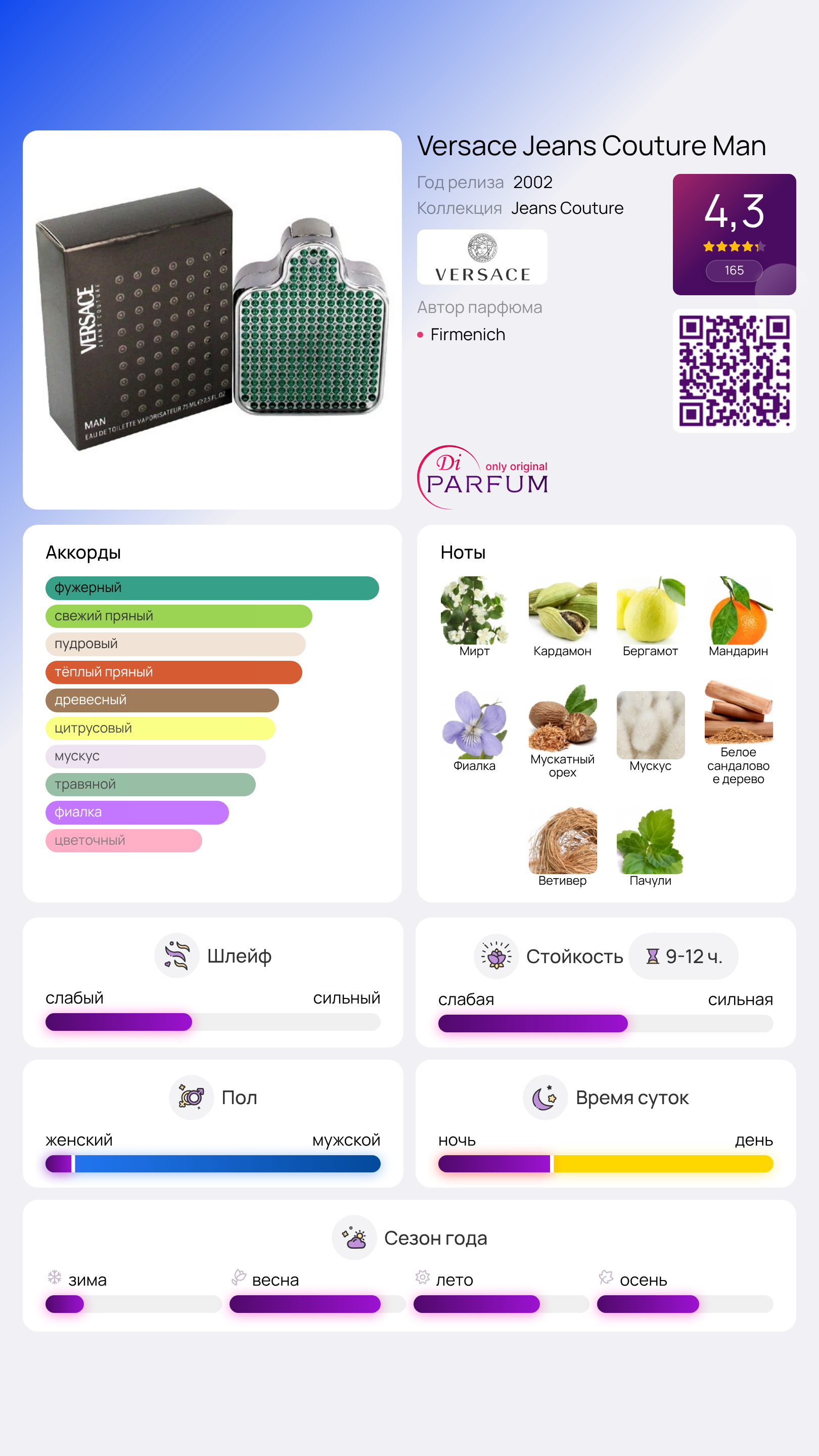 В 2002 году культовый бренд Gianni Versace представил аромат для мужчин под названием Jeans Couture Man. Его уникальный флакон серебристого цвета, украшенный изумрудными блистательными кристаллами, стал настоящим восторгом для коллекционеров и желанным предметом для поклонников оригинальных ароматов.