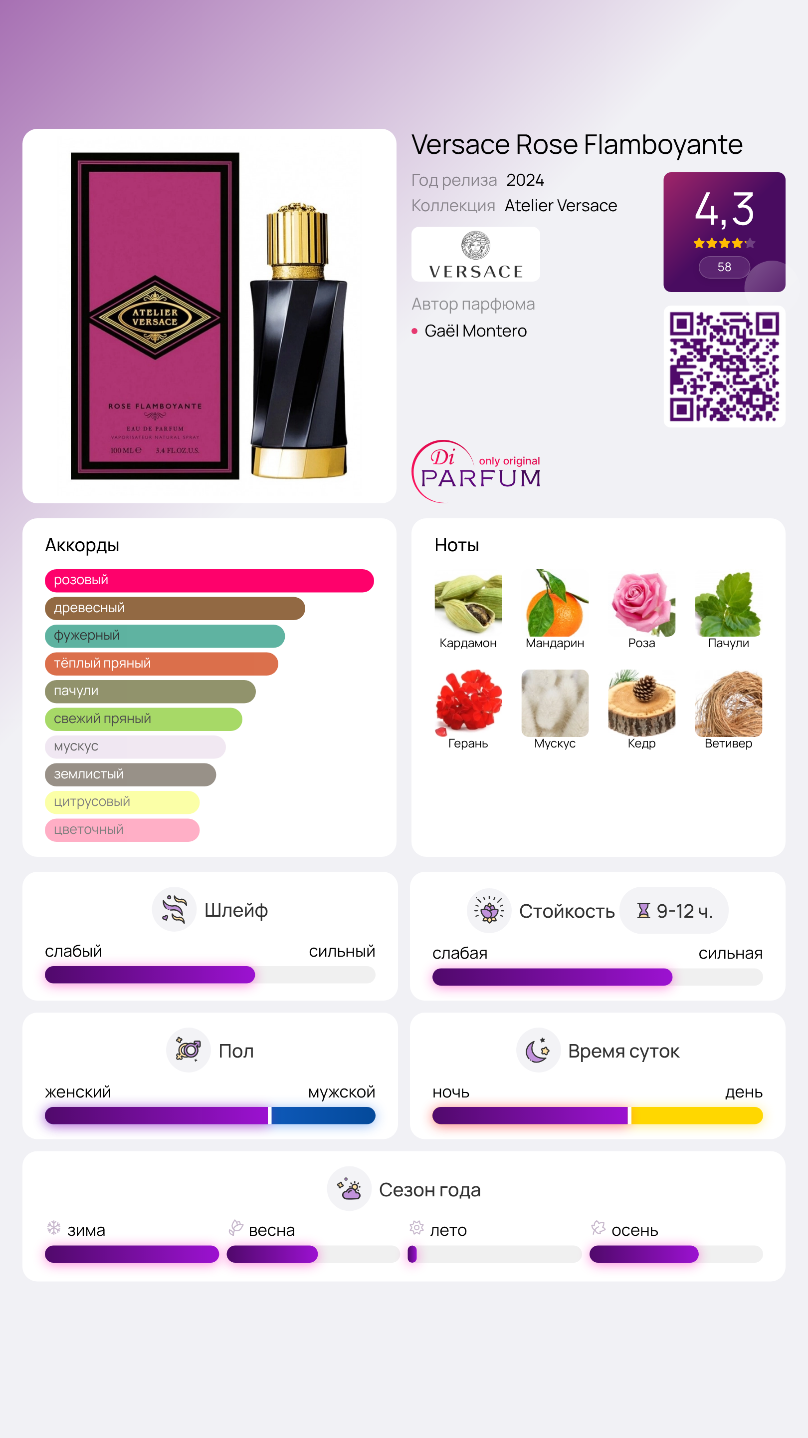 Изящная бутылка парфюма имеет скульптурный дизайн и украшена гравировкой с названием аромата, а упаковка выполнена с эмблемой Atelier Versace. Rose Flamboyante идеально подойдет тем, кто ищет уникальный и многогранный аромат, который подчеркнет их индивидуальность и стиль.