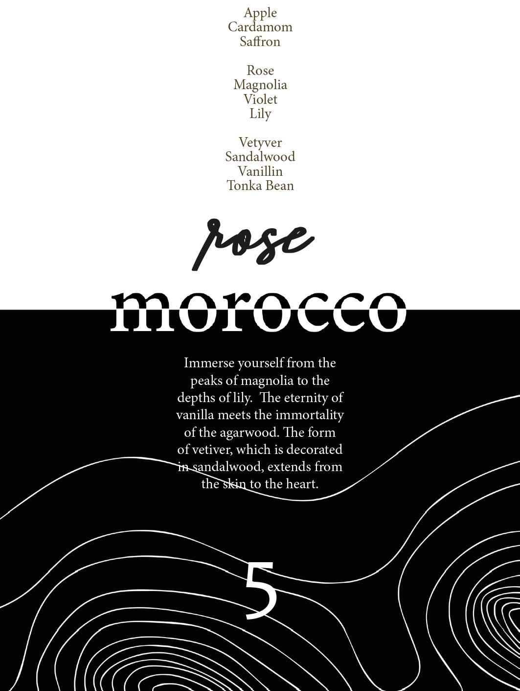Изящная лилия и экзотическая магнолия излучают фиолетовую свежесть, в то время как бархатный персик добавляет нот сладости в цветочную симфонию. Ноты сердца звучат по-новому с фоном древесных аккордов белого кедра и бальзамического кашмирского дерева. Уникальная унисекс-композиция Rose Morroco демонстрирует страсть, сексуальность и явные восточные мотивы. Насыщенный шлейф переливается яркими нотами влажного ветивера.