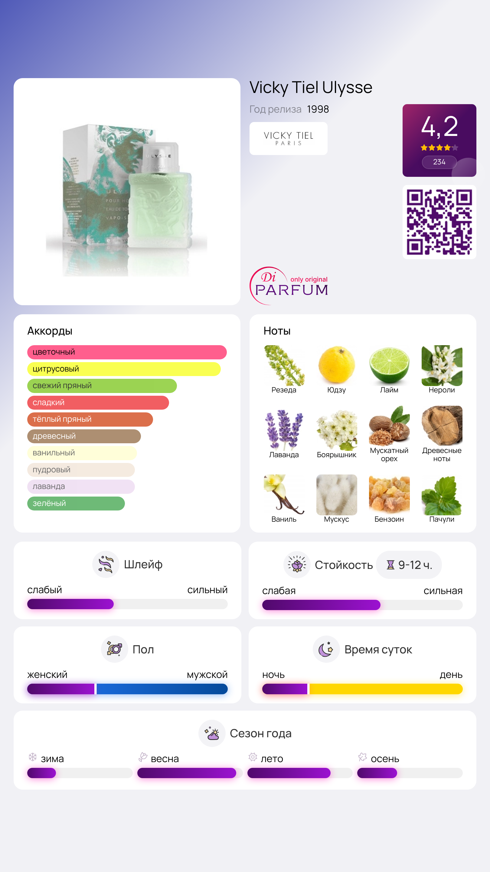 Коллекция одежды и парфюмерии марки Vicky Tiel представляет собой воплощение утонченного стиля и отличного вкуса. Ароматы этого бренда пользовались популярностью в прошлые годы, и многие из них можно считать винтажными. К таким ароматам относится знаменитый Ulysse, который отличается характерным для 90-х дизайном флакона и объемным шлейфом.