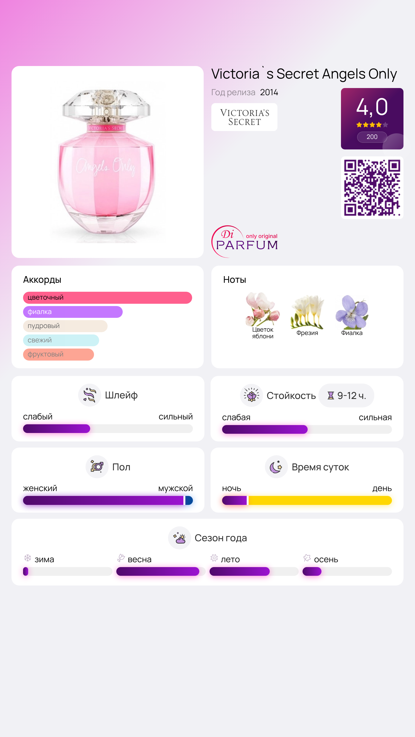 В элегантном розовом флаконе скрыто великолепное красное яблоко – сочный, сладкий и хрустящий, дополненный нотами яблоневого цветка, фрезии и фиалки. Уникальность Angels Only в том, что он не оставляет яркого следа, но тем не менее позволяет своей владелице ощутить его присутствие и наслаждаться этим восхитительным ароматом в течение долгого времени, оставаясь при этом незаметным для окружающих.