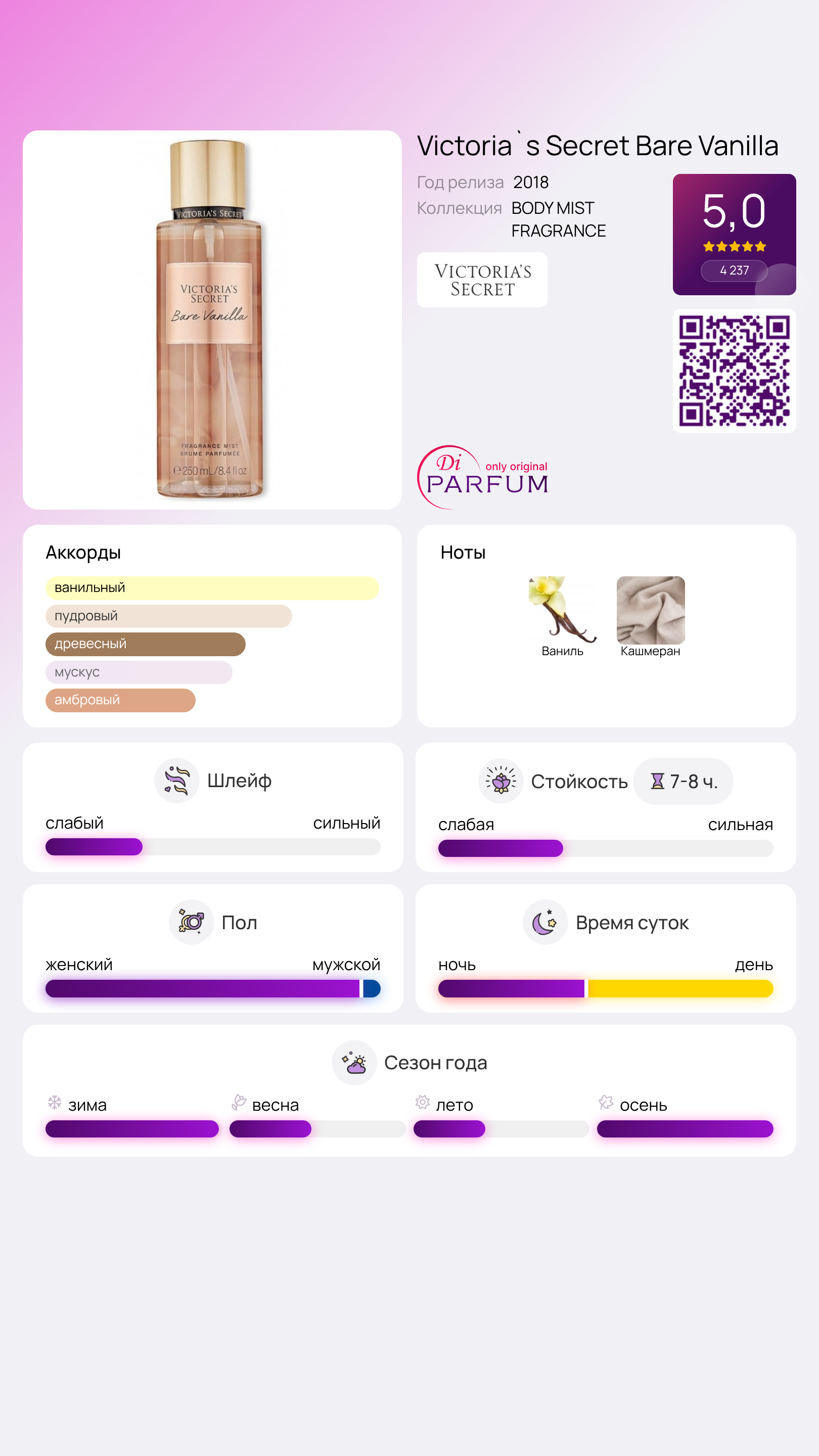 Victoria's Secret Bare Vanilla – это аромат, наполненный сладостью, уютом и соблазном. Он является воплощением настоящей красоты и деликатности, обеспечивая тепло даже в холодные дни. Этот запах создает мягкую атмосферу и привлекает благодаря своей восхитительной ольфакторной игре, которая захватывает с первых мгновений.