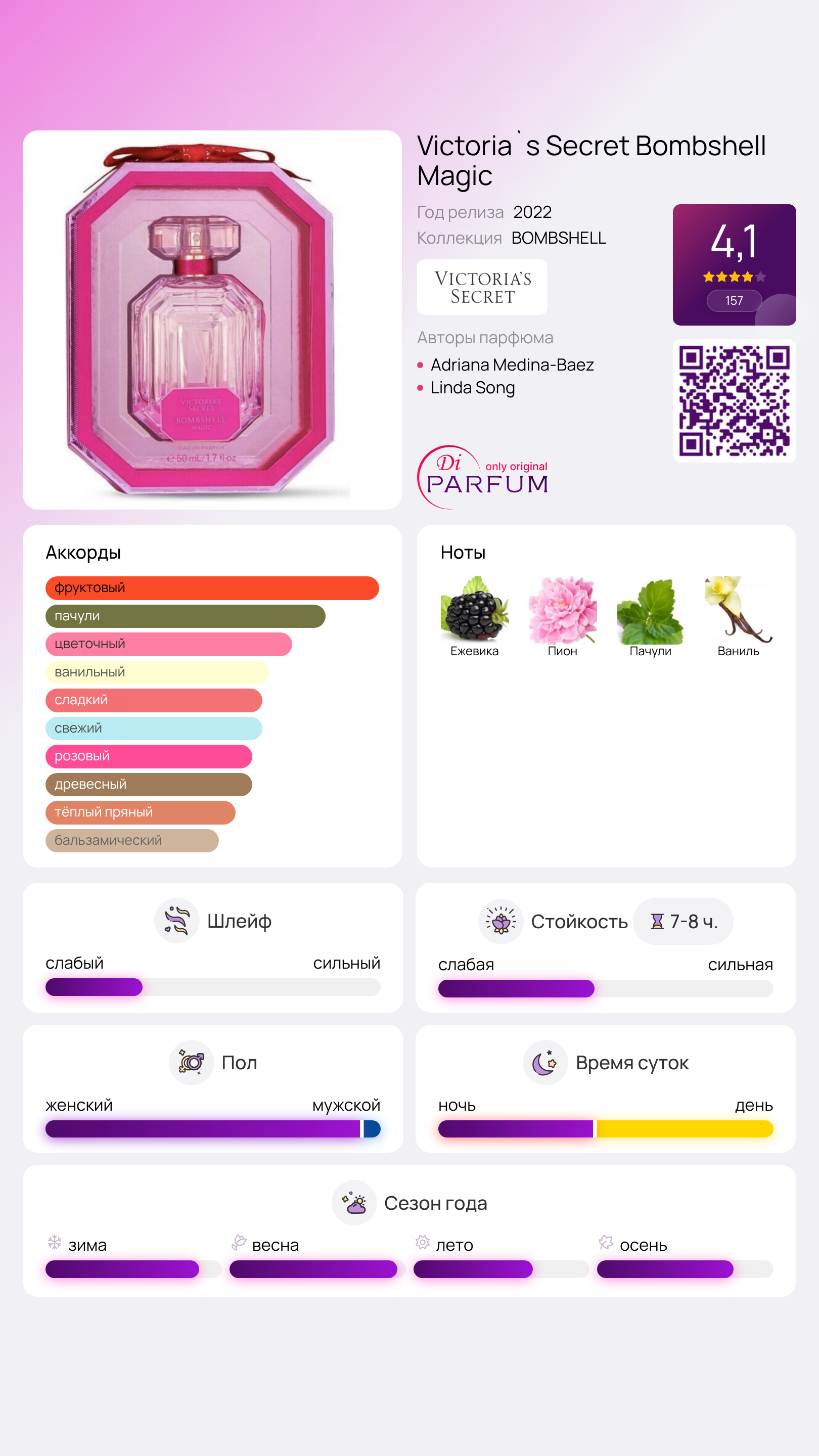 Аромат Victoria`s Secret Bombshell Magic с теплым цветочно-фруктовым звучанием наполнен атмосферой гламурных торжеств. Он представляет собой более загадочную интерпретацию оригинала 2010 года. Непредсказуемый микс лепестков и ярких ягод создает уникальную парфюмерную волну, которую сложно назвать иначе, как незабвенной подписью знаменитого американского бренда, известного своими роскошными изделиями для женщин.