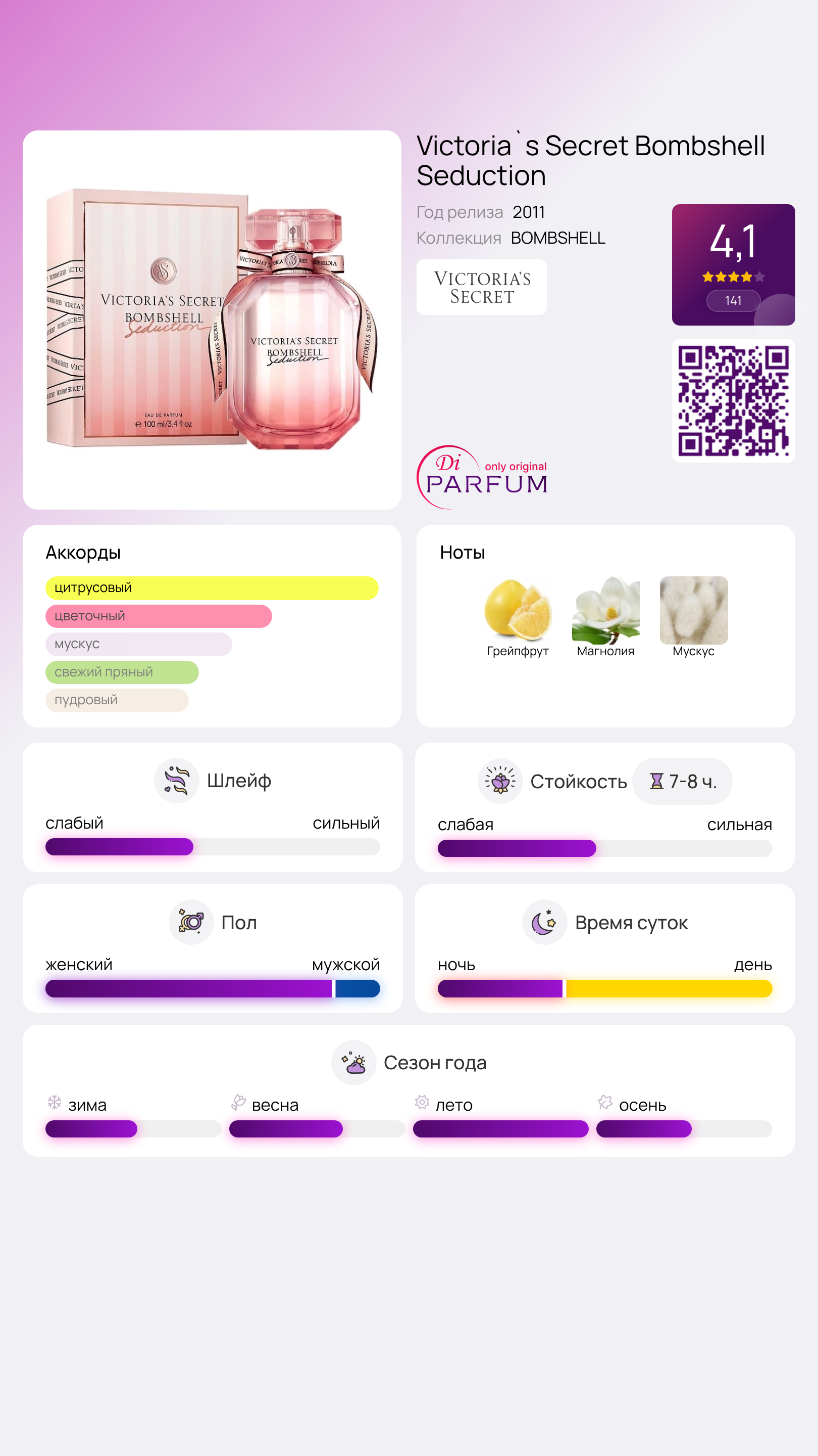 Бренд Victoria’s Secret представляет аромат Bombshell Seduction в рамках своей коллекции Bombshell. Флакон оформлен в фирменном стиле, а цветочно-фруктовая комбинация делает его легко узнаваемым среди поклонниц. Хотя композиция ароматов проста, это не уменьшает ее привлекательности. Сочетание грейпфрута, мускуса и магнолии создает гармоничный аккорд, который навевает воспоминания о теплых вечерах мая, когда белые цветы наполняют воздух своим ароматом, внушая желание наслаждаться жизнью.