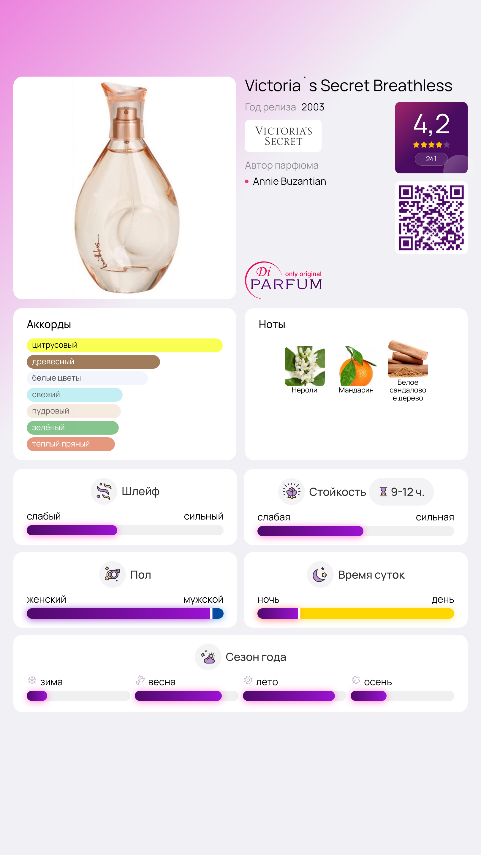 Бренд Victoria's Secret представил новый очаровательный женский парфюм под названием Breathless. Этот романтический и интригующий аромат сочетает древесные и цитрусовые ноты, нежно обволакивая женщину и погружая её в изысканную атмосферу соблазна и искренности.